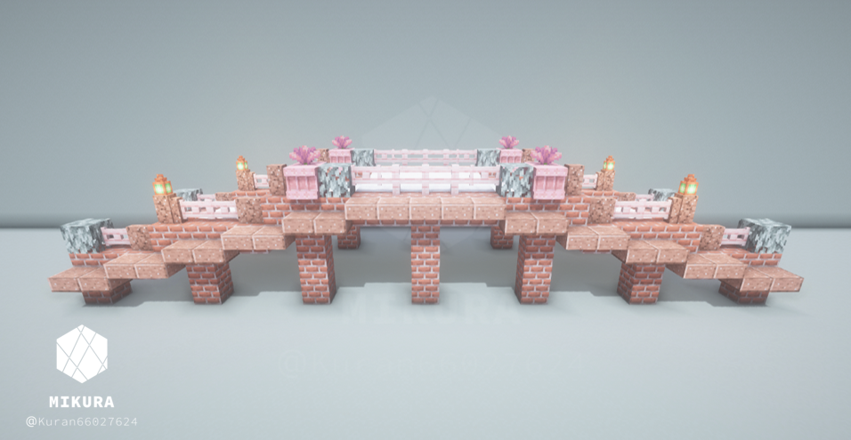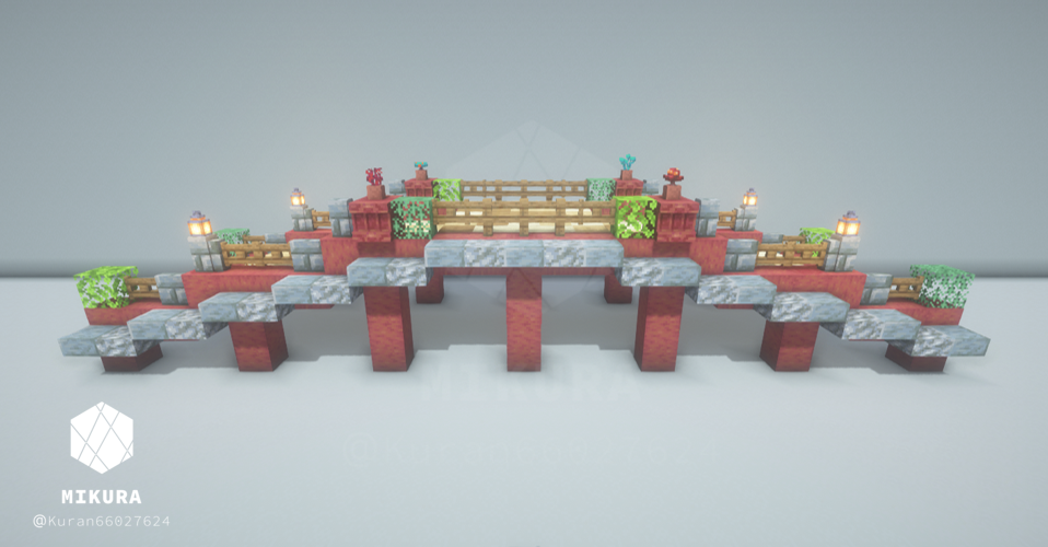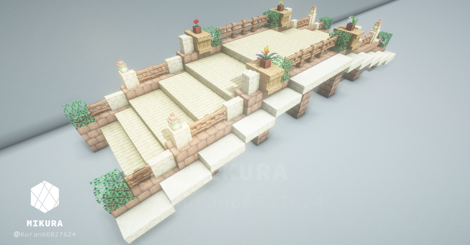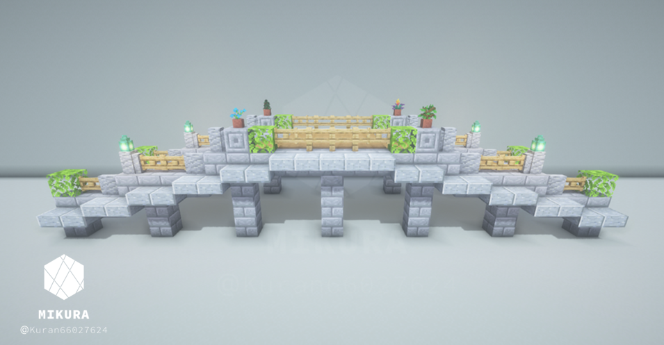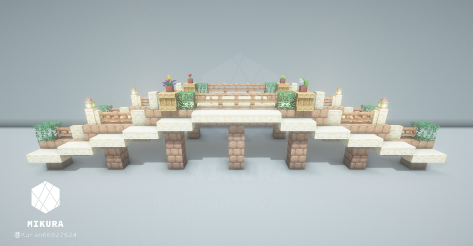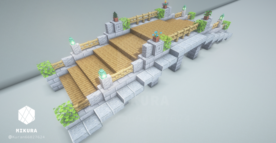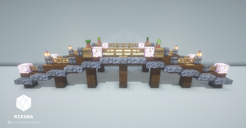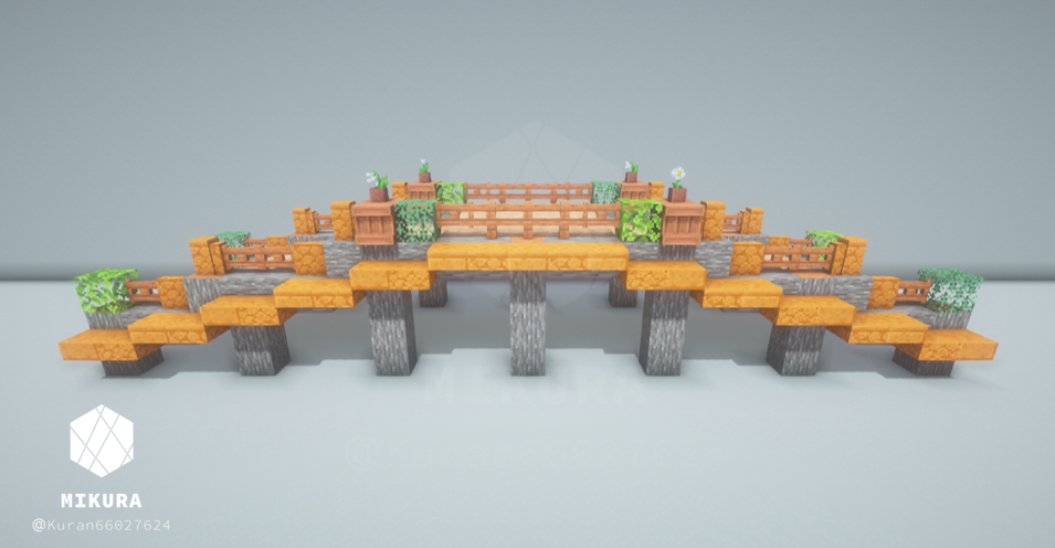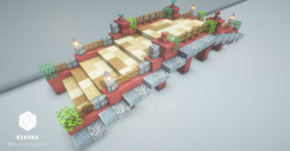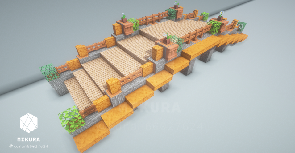 上のいかつい橋のアイデアを、より軽い印象でも使いたくて作成した木製の橋のアイデアです。そのバイオームに生えている木材に合わせて作ると景観と馴染みやすいと思います。