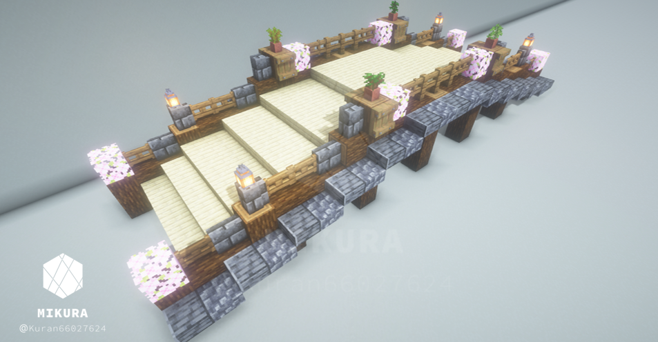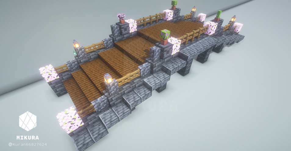 和風建築でも使えそうな橋を作りました。桜の葉ブロック・ダークオーク・トウヒのフェンスを組み合わせています。