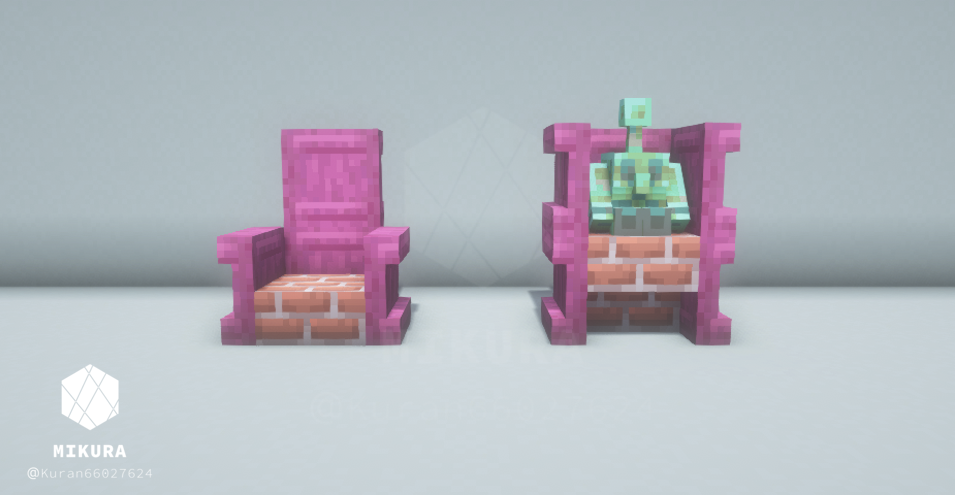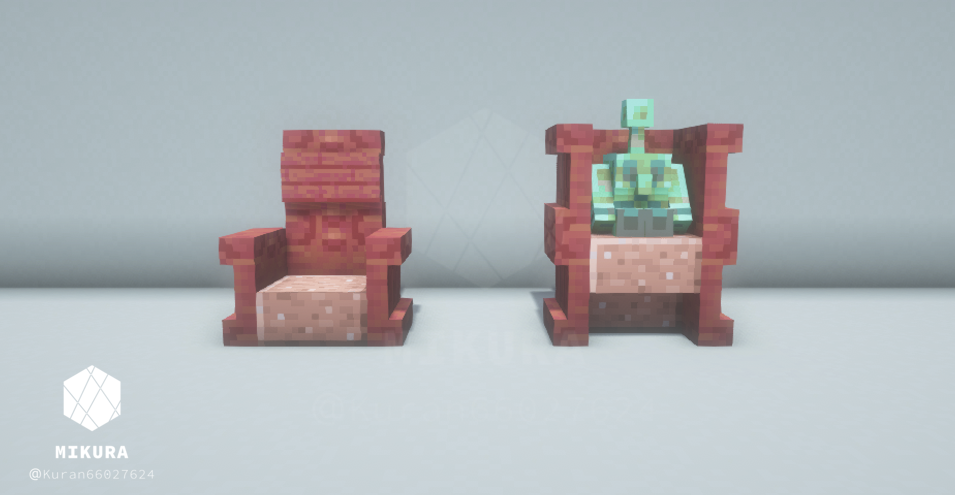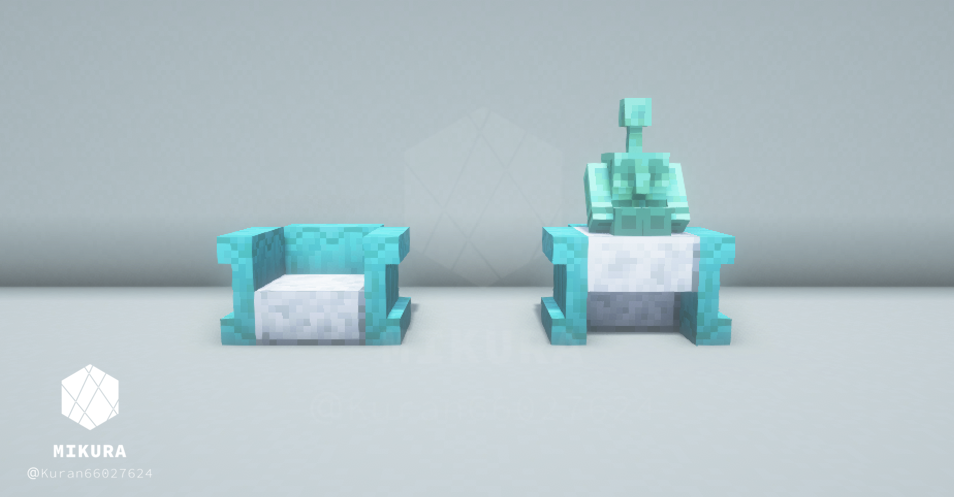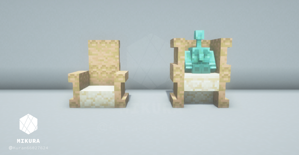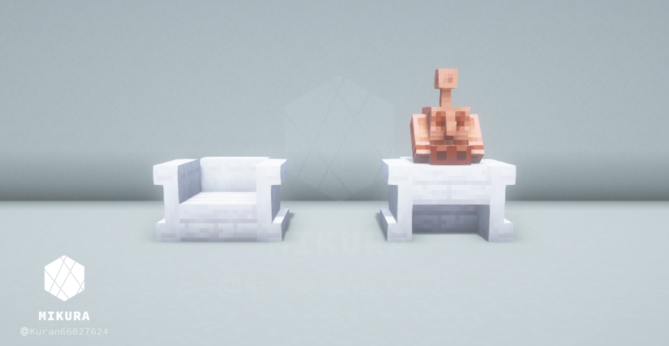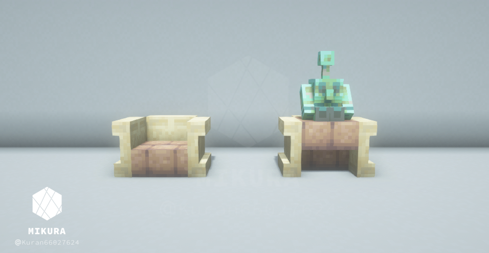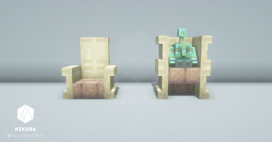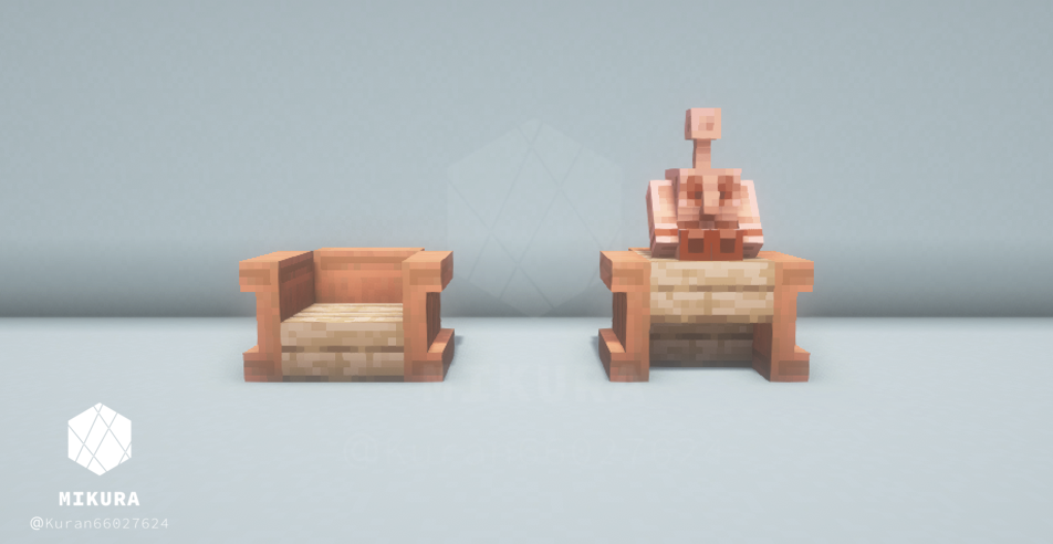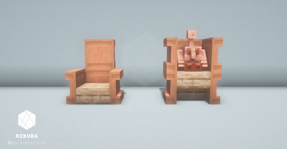 ハーフブロックで作る定番の椅子だと、銅ゴーレムさんが座れない(ハーフブロック上に浮いてしまう)ので、シンプルな椅子と一緒に銅ゴーレムさんが一緒に座れそうな椅子を合わせて作りました。