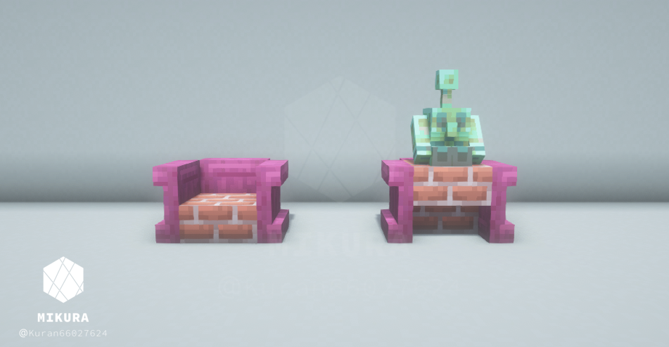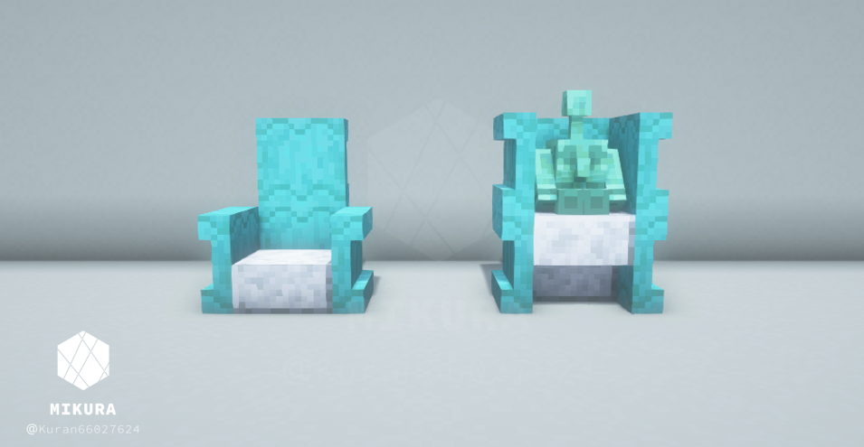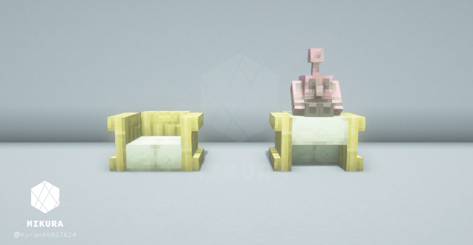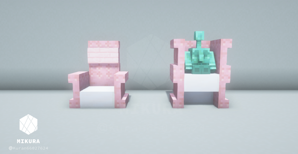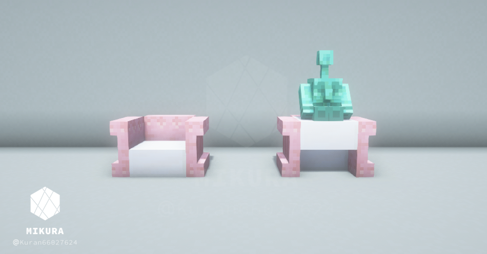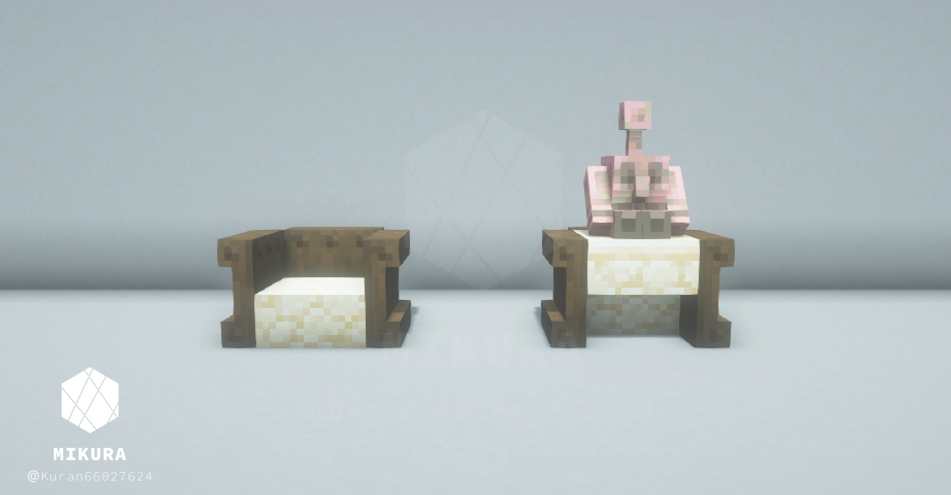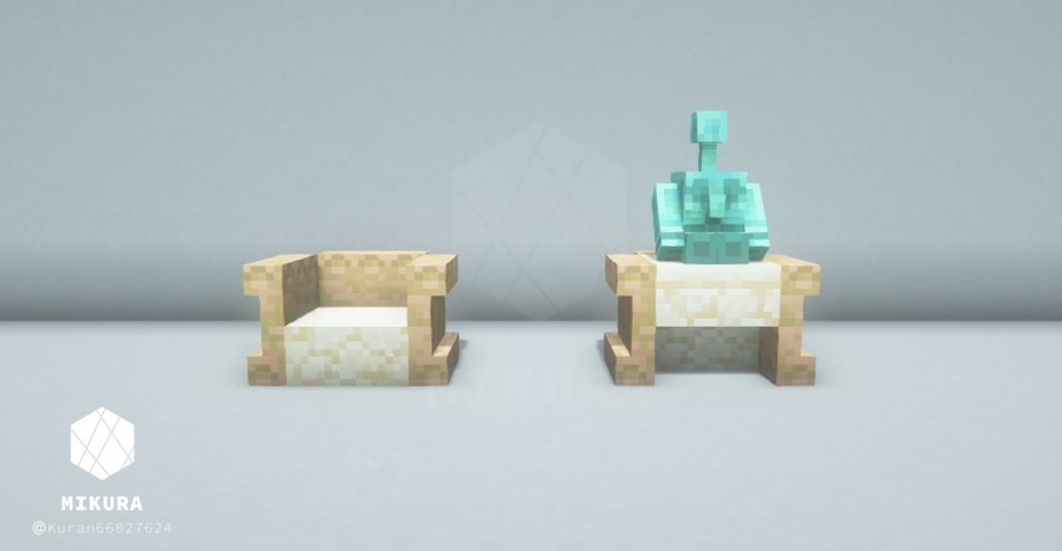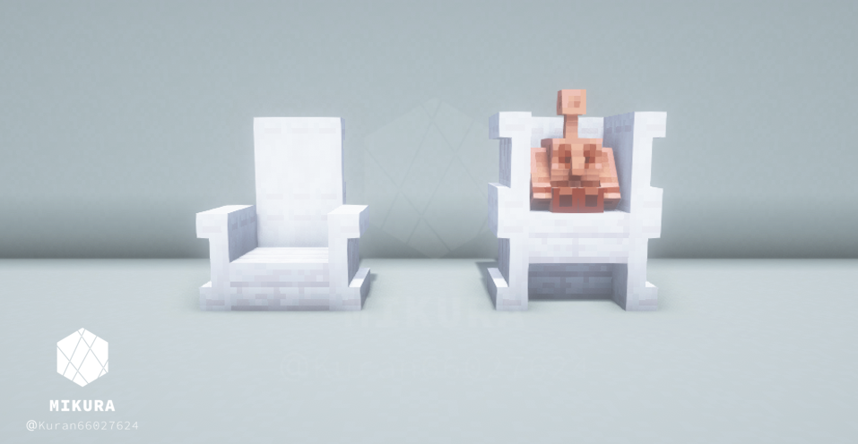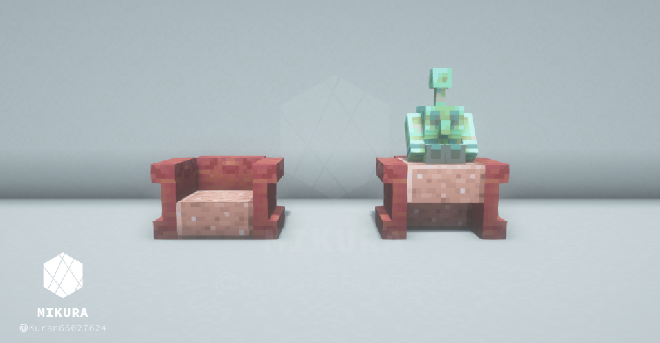 ハーフブロックで作る定番の椅子だと、銅ゴーレムさんが座れない(ハーフブロック上に浮いてしまう)ので、シンプルな椅子と一緒に銅ゴーレムさんが一緒に座れそうな椅子を合わせて作りました。