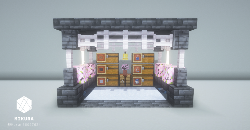 上の中サイズの粘土生産スペースよりも大きめの作りにしたデザインです。収納(背面のチェスト)も多めにしています。水路を境に右と左に分かれているので、鍾乳石の有無を変えて、片側を泥ブロック生産用・もう片方を粘土生産用にすることも可能です。