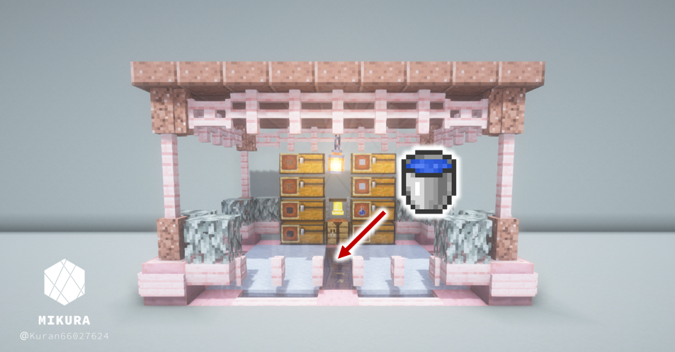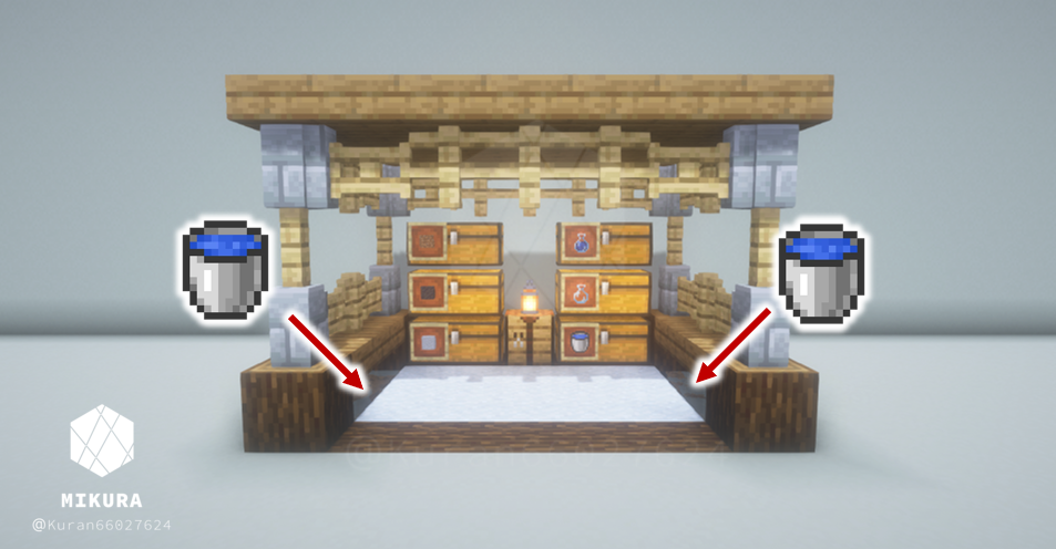 下画像のように、サイドのハーフブロック下に無限水源を仕込んでいます。ガラス瓶に水を入れて水入り瓶にし、土を泥ブロックにしてください。