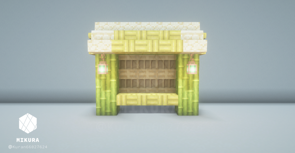 掲示板の4デザインです。棚ブロックを使用しているので、アイテムをはめ込んで使用することが可能です。暗くならないようにランタンも設置しております。