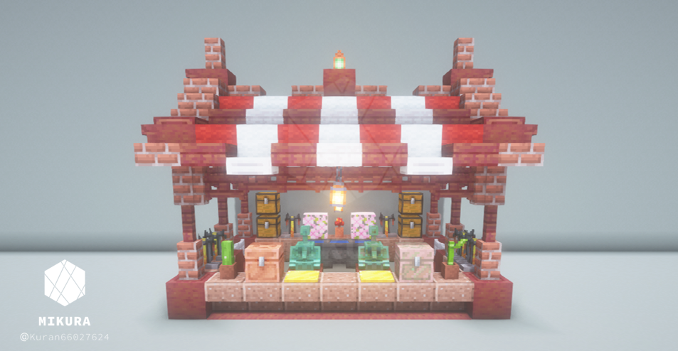Minecraftバージョン1.21.10で追加された棚ブロックや銅系ブロックを使用して、和風建築用の装飾デザインを作りました。