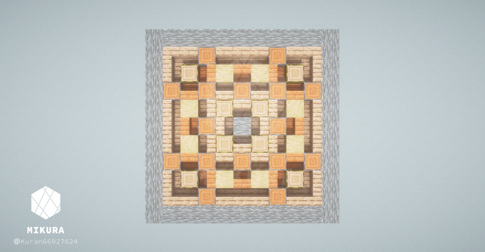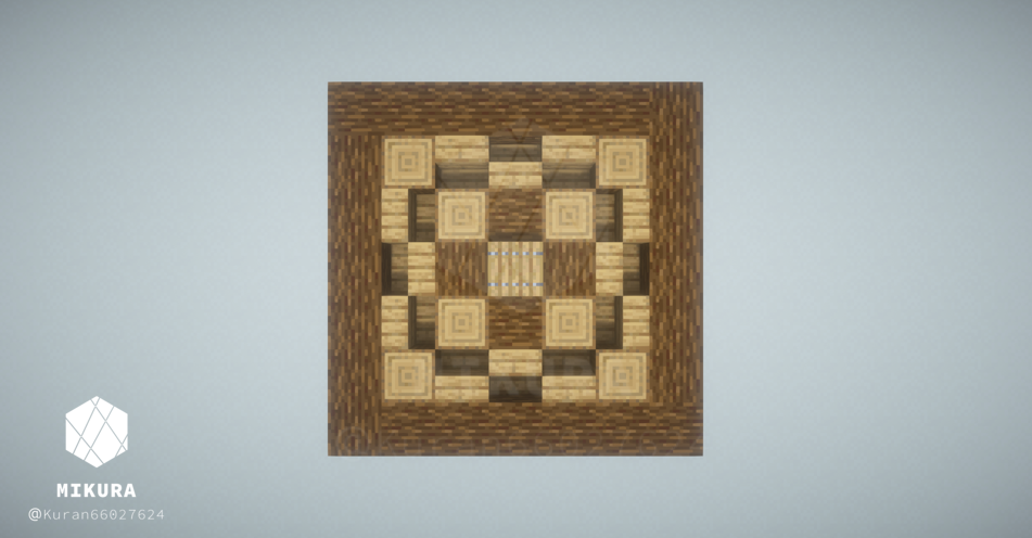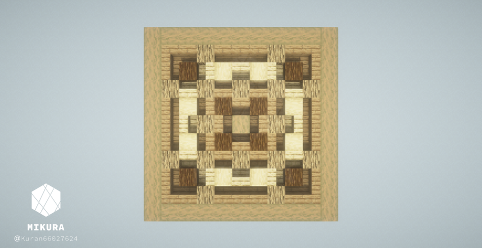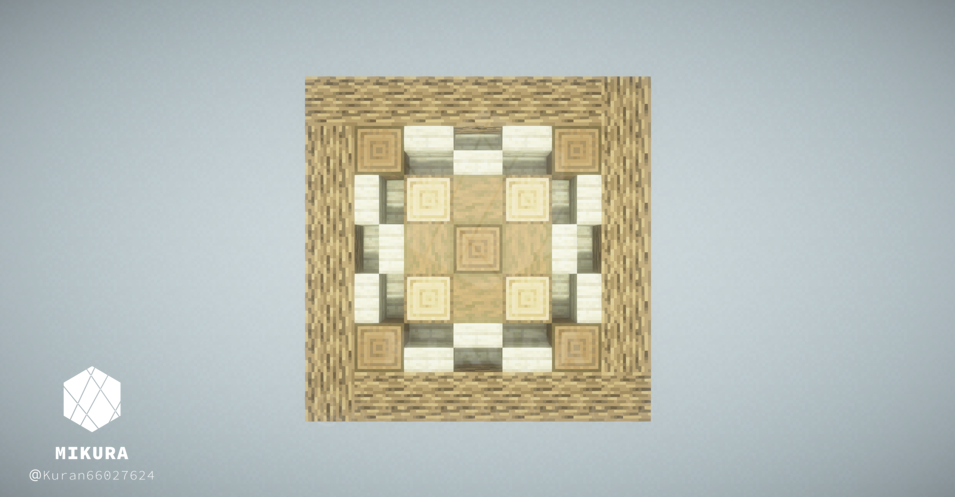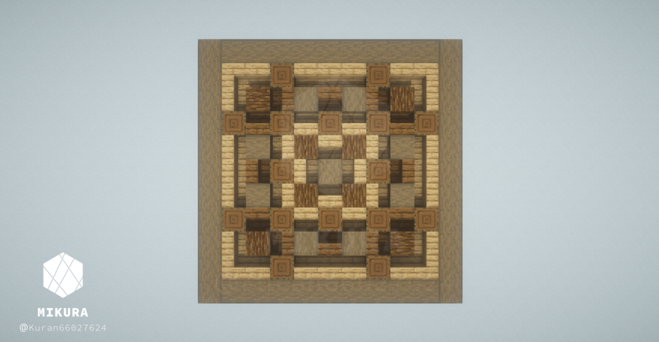 同じく11×11の中サイズで作った床デザインです。木材系ブロックで作成し、温かみのある見た目に作ってみました。