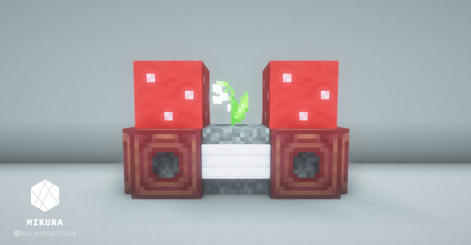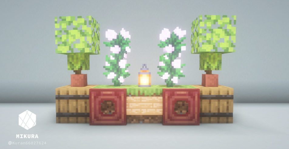 幅3ブロック・奥行1ブロックの小さな植木のデザインです。(トラップドアを含めると5ブロック×3ブロック)苔ブロック・泥ブロックなど、土台のブロックに合わせてデザインを変えているので、その土地に合わせた色味のブロックを選ぶといい感じになると思います。