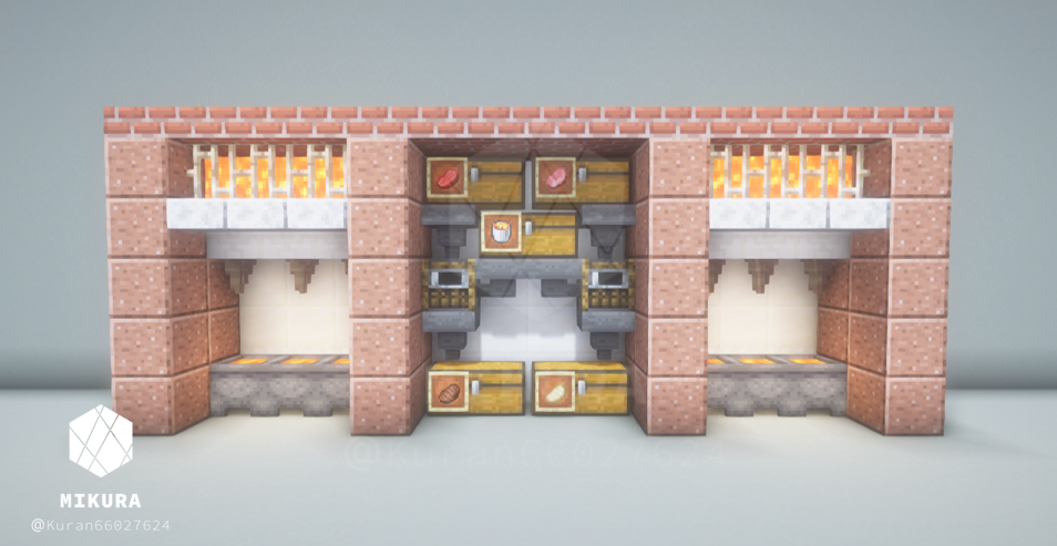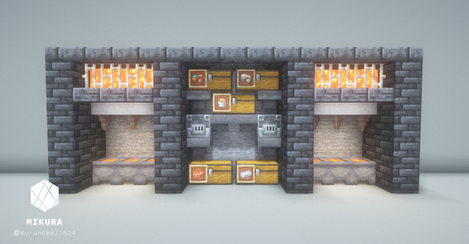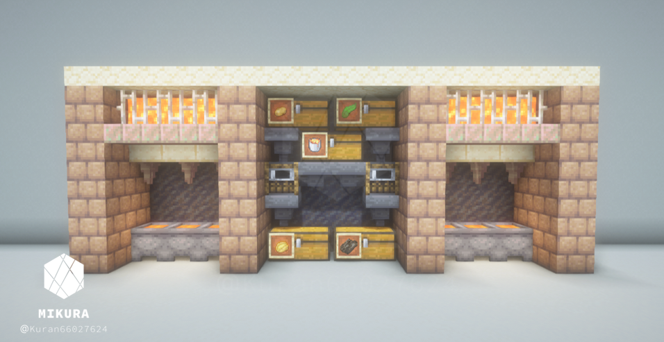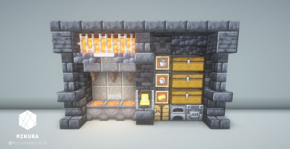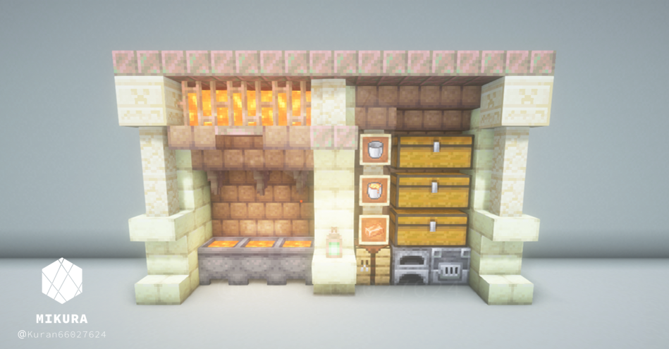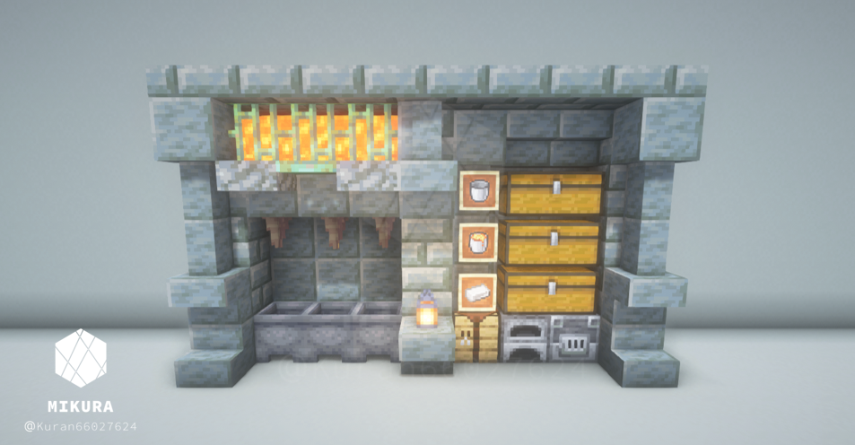 マグマ製造機と合わせて収納スペースとかまどを設置したアイデアです。省スペースにできるだけの要素を詰め込みました。
