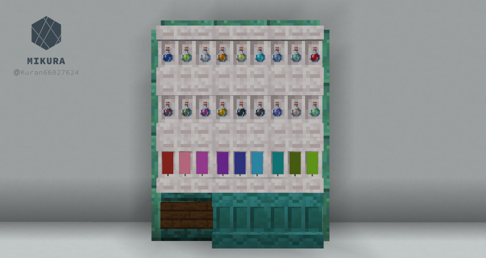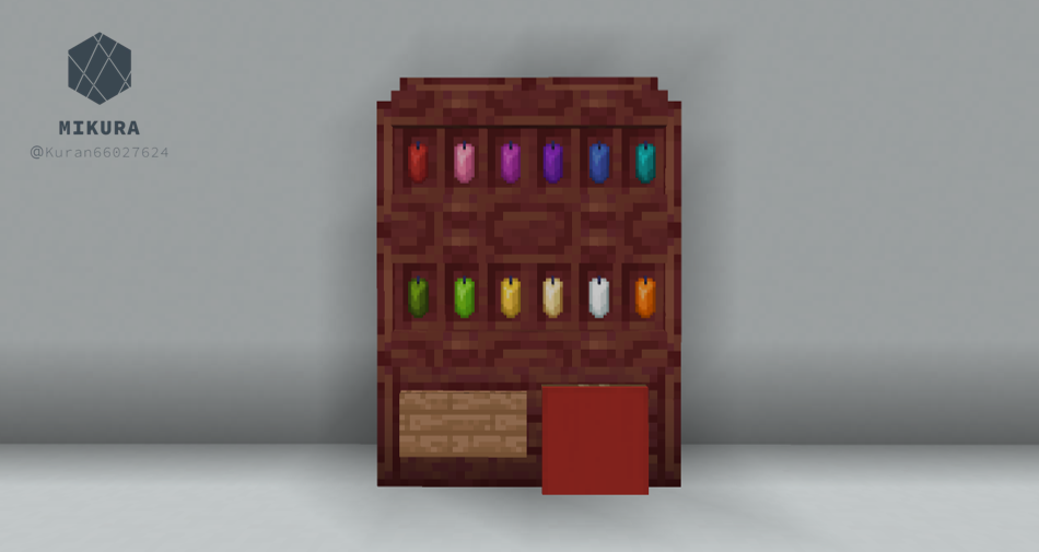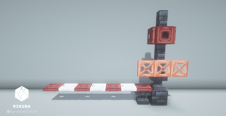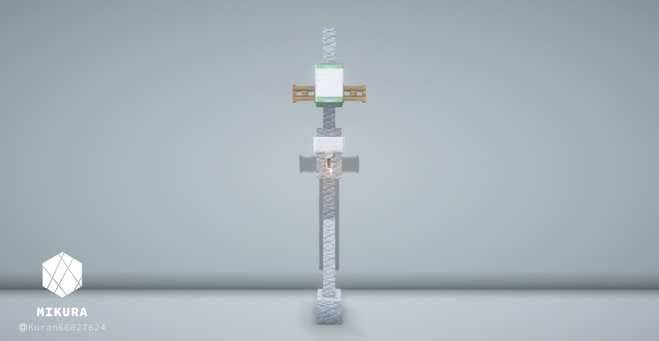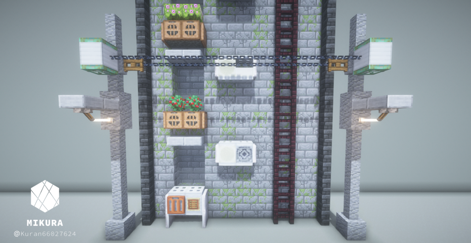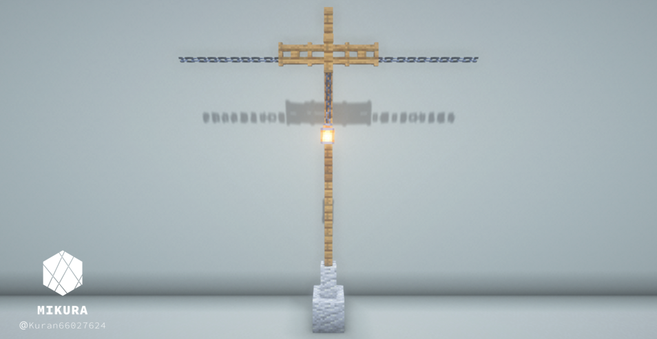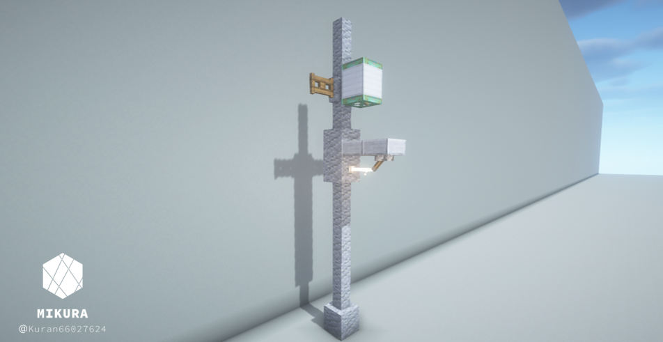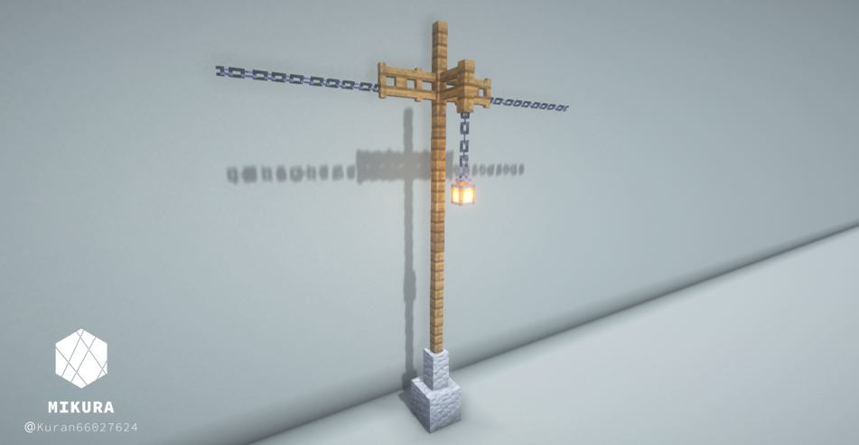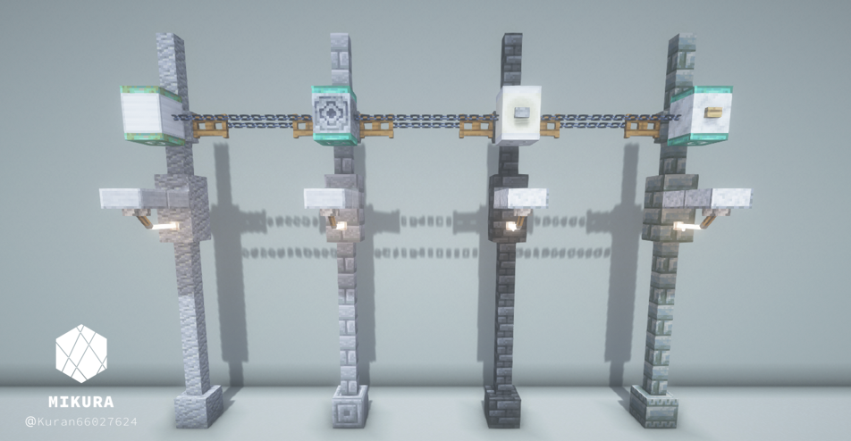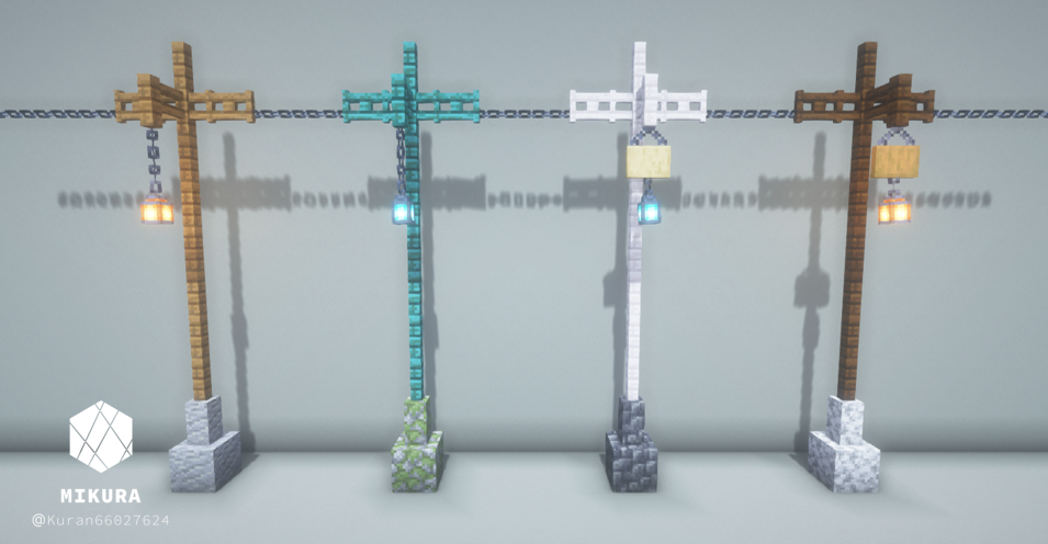 電信柱は、街の建物の雰囲気に合わせて使用ブロックを変えるといい感じになると思います。下画像のようにそれぞれを鎖などの装飾ブロックでつなげてご使用ください。