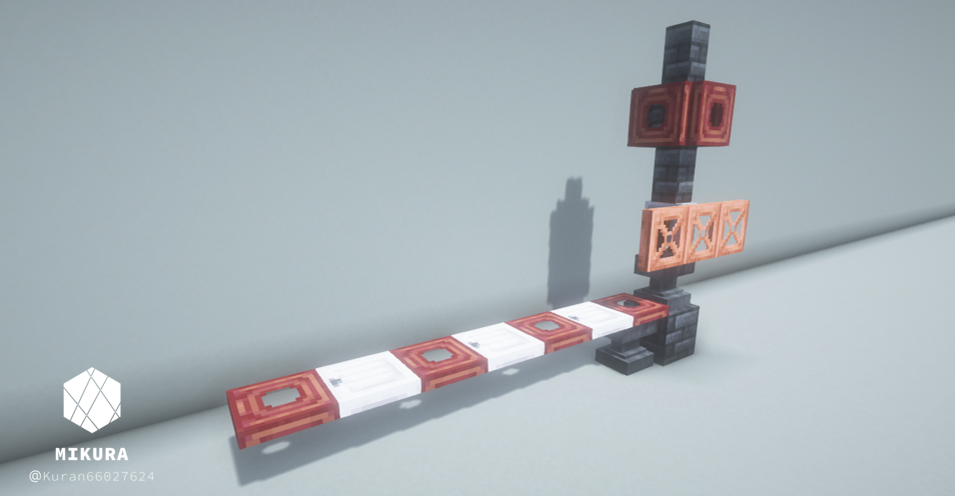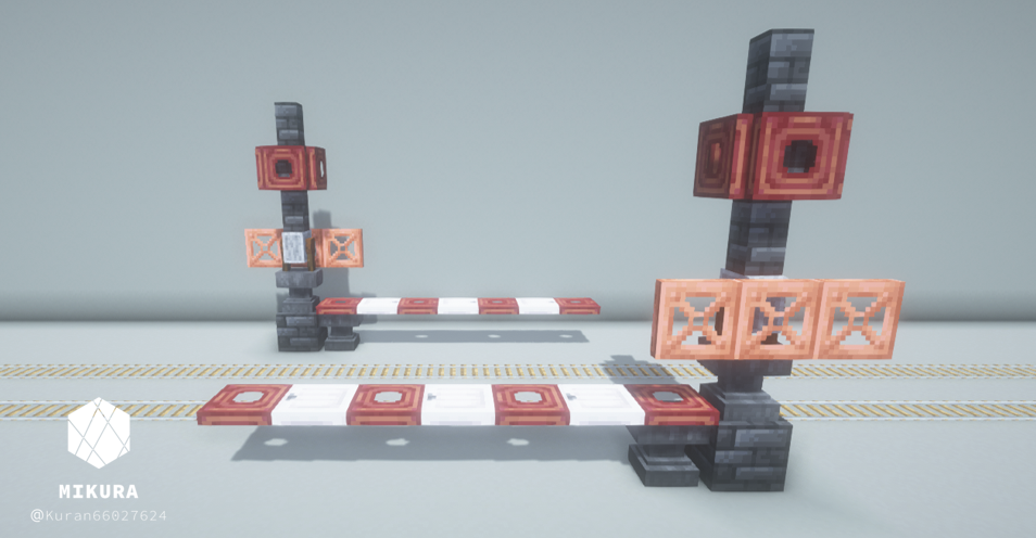 道幅に合わせて、対角上に設置することで踏切の見た目にすることができます。