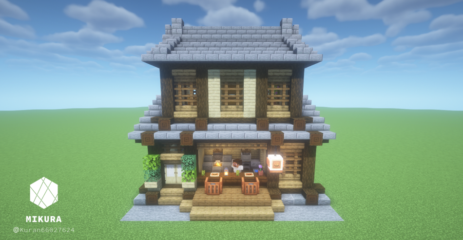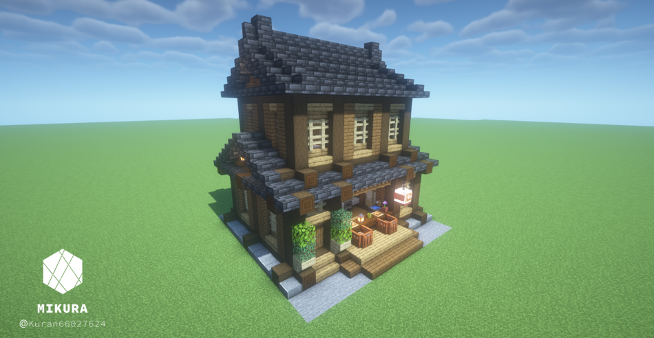 柱はダークオークの原木・屋根は石レンガを使用した、和風の家のデザインです。