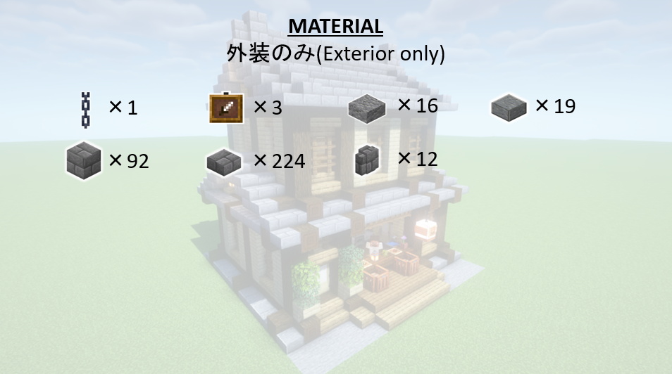 内装をこだわりだすとブロックがいくつあっても足りないので、材料は外装のみ(内装部は柱等のみを含めた)数をご紹介しております!