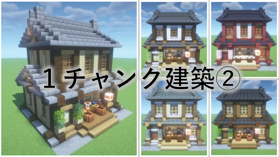 1チャンク建築シリーズの第2弾です。こちらのブログではアレンジ画像を載せており、作り方は動画でご紹介しております。1チャンク(16×16ブロック)以内におさまるようにしました。色違いに複数種類作っているので、横に並べて街風の見た目にすることもできると思います。