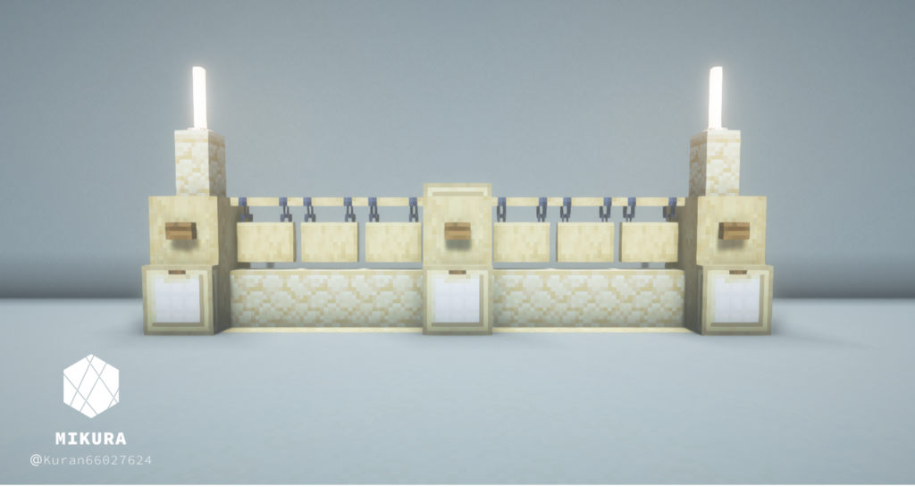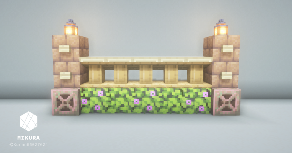 装飾に吊り看板を使用した塀のデザインをまとめました。吊り看板の下には塀ブロックを設置しているので、1.5ブロックの高さがありMOBが乗り越えることができず、塀として使用することができます。木を含んだ塀デザインを作りたいときにおすすめのデザインです。