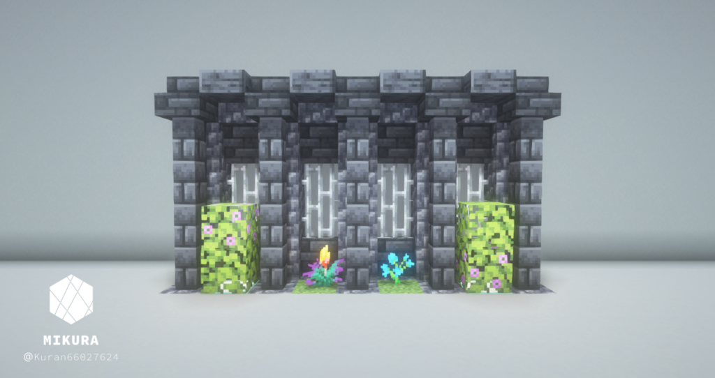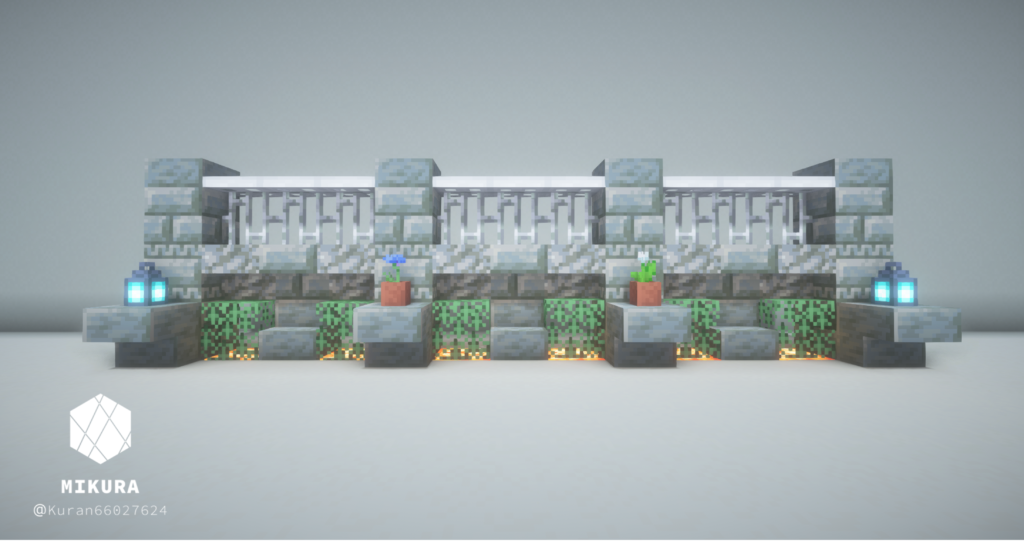 全体の高さが5~6ブロックある、強固な塀デザインをまとめました。1ブロックおきに素材を変えている、シンプルな作りです。シンプルな分、横に自由に伸ばしたり、縦横に交差させたりと、自由にアレンジしやすいデザインだと思います。