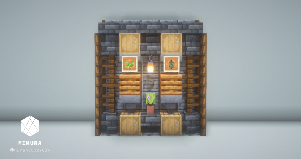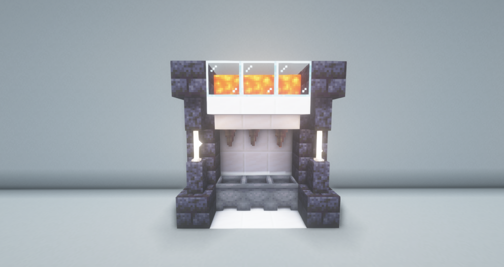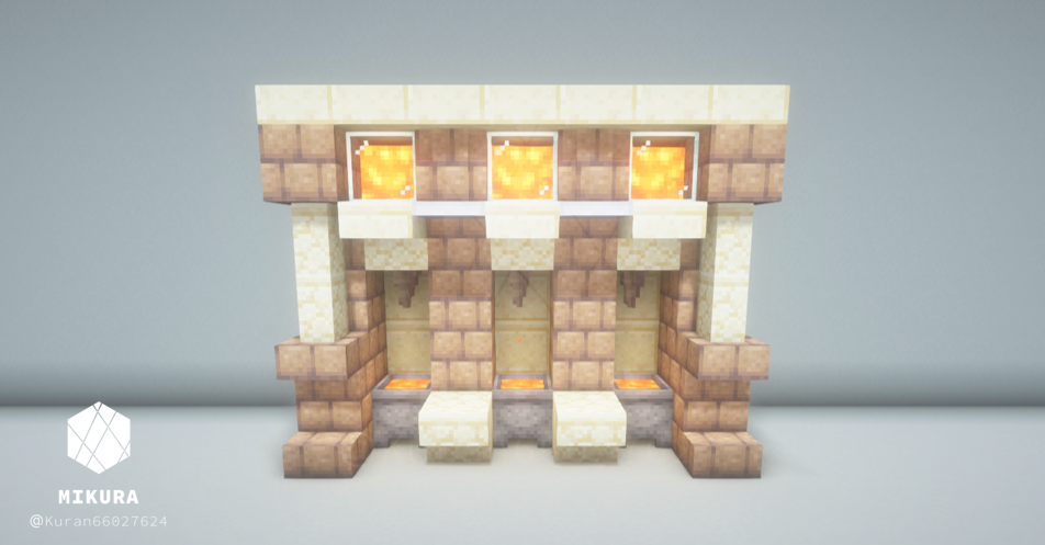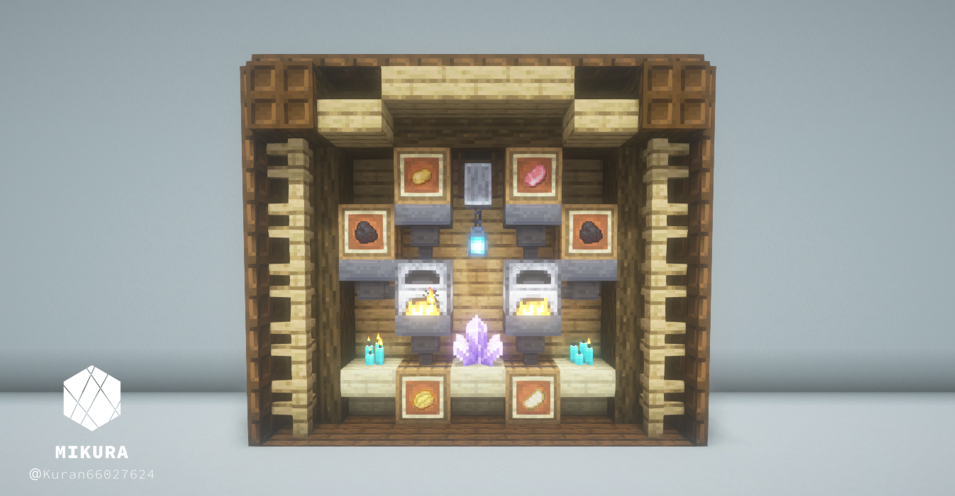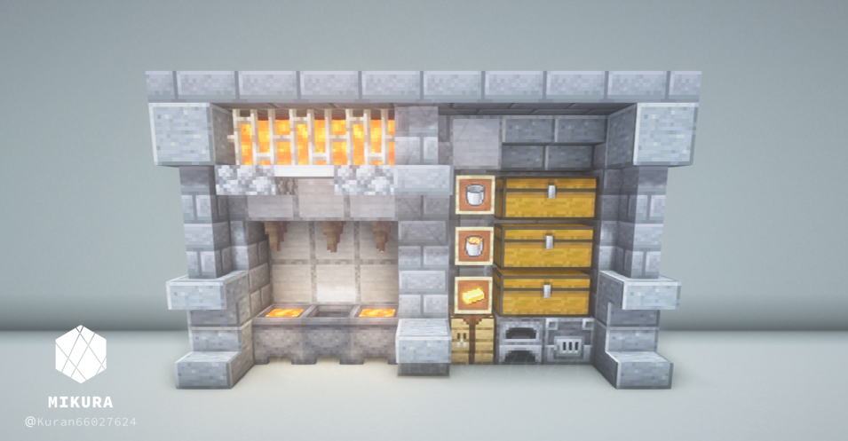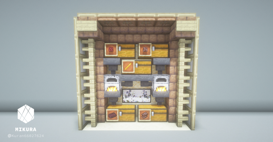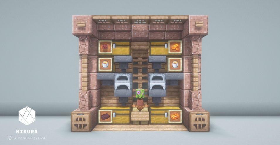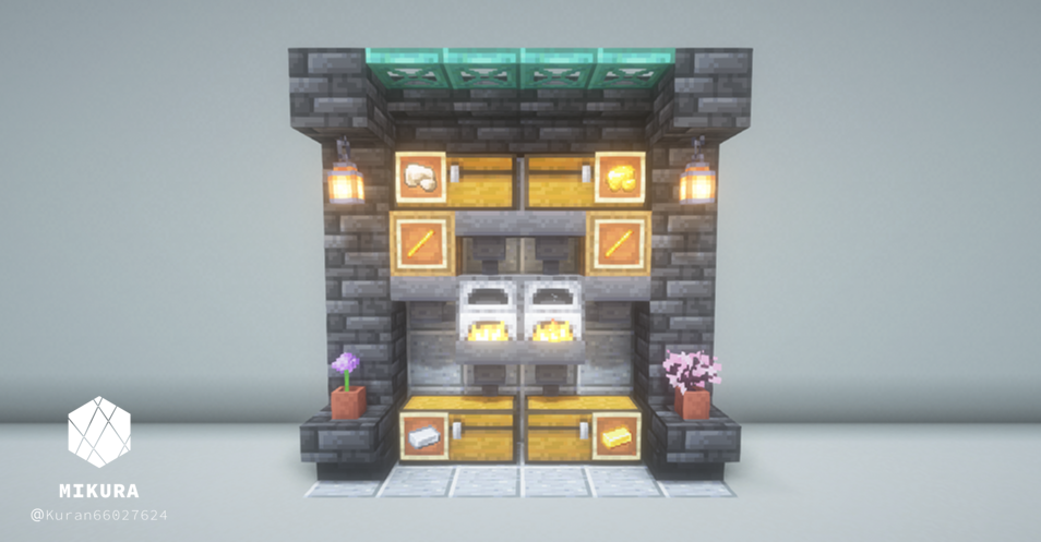 自動かまどの作り方と装飾アイデアをまとめました。上部の収納系ブロックに入れた精錬前のアイテムを、自動で精錬して下部のチェストに収納してくれる装置です。