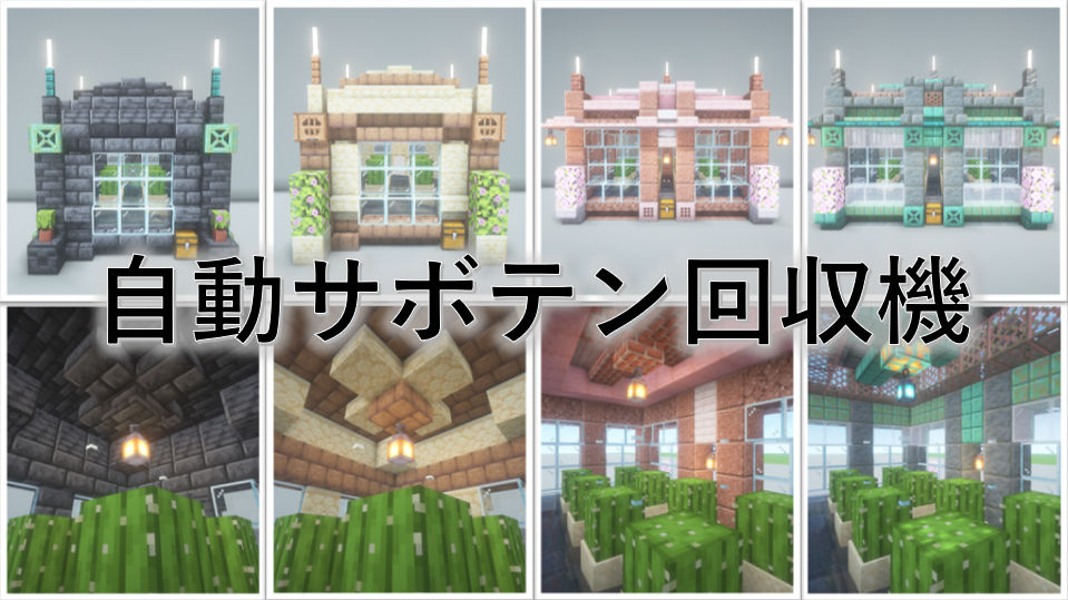 自動サボテン回収機の作り方と、装飾のアイデアをまとめました。サボテンはそれほど使用用途の多いブロックではないので、最小効率・見た目重視で作成しています。最小効率ではあるものの、自動サボテン回収機は放置していれば、確実にサボテンが増えていくので、サバイバル序盤で作っておくのにおすすめの自動アイデアです。