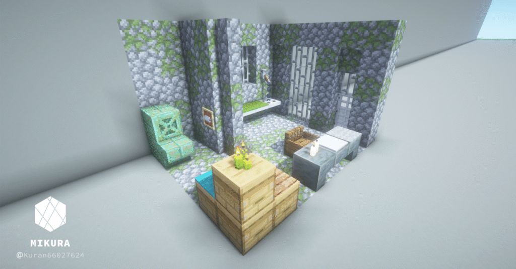古びた牢屋感を出すために、苔むした石レンガや丸石を使用しています。牢屋の床もところどころハーフブロックに変えてデコボコしている感じにしてみました。