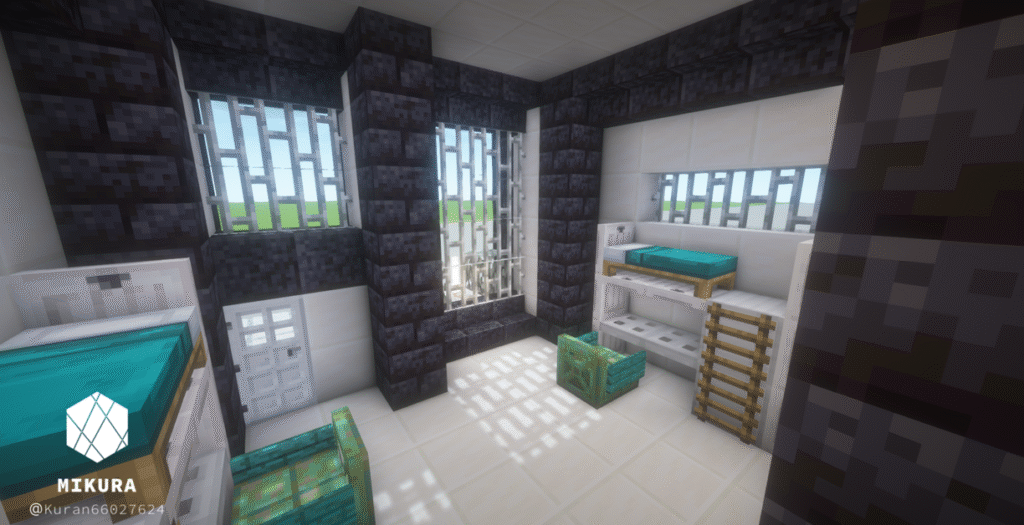 これまでの牢屋は2段ベッドを2つ並べていましたが、こちらは(下をデスクにして)ロフトベッドにしています。深層岩の外装に白系ブロックで内装を作ったので、より堅牢な見た目になりました。