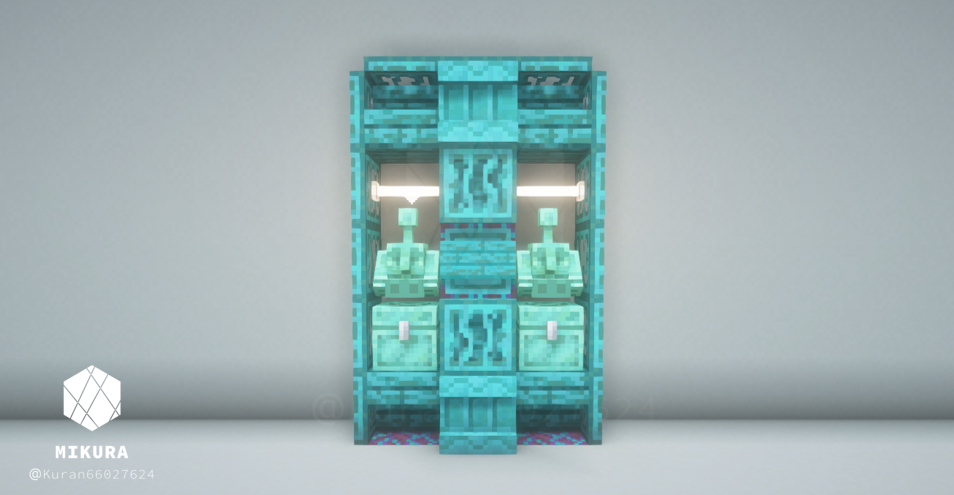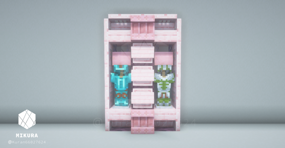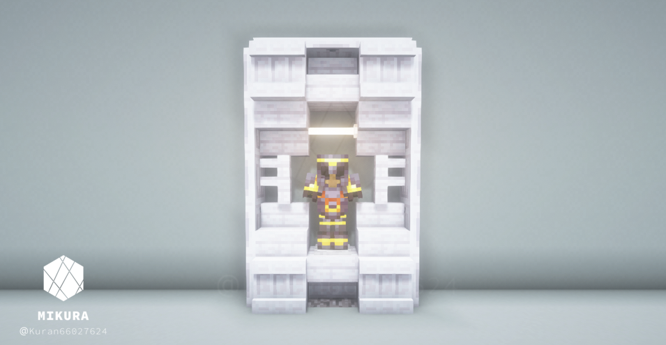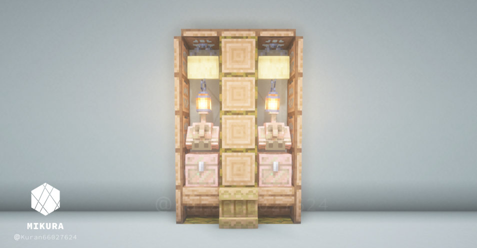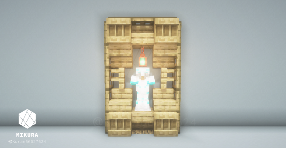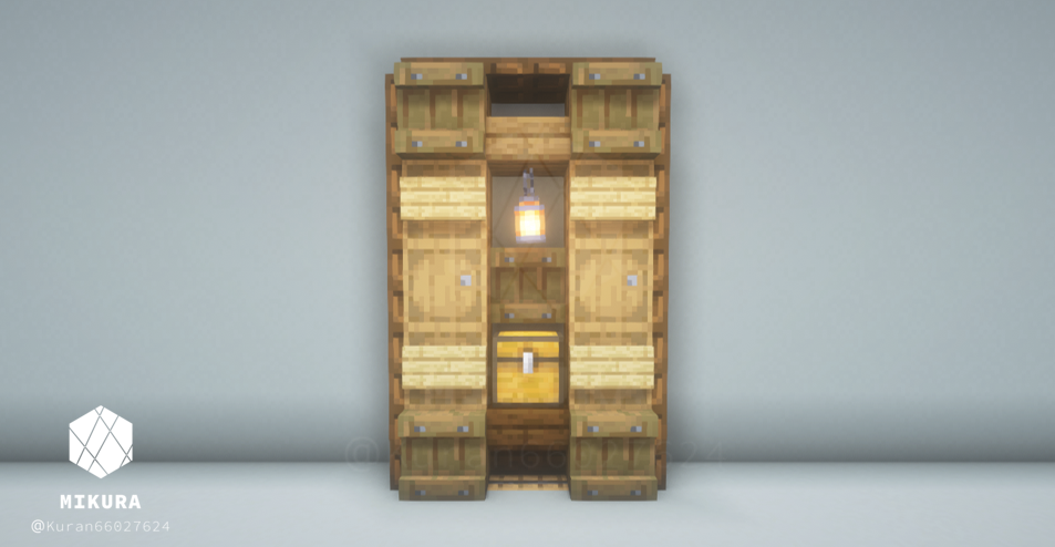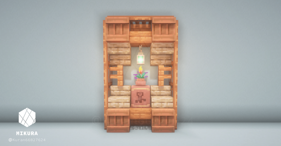 オーク系素材(原木・階段・フェンス・トラップドアなど)を複数組み合わせて棚のような見た目にしたデザインです。逆さ階段からはランタンをぶら下げることができるので、光源としても使うことができます。