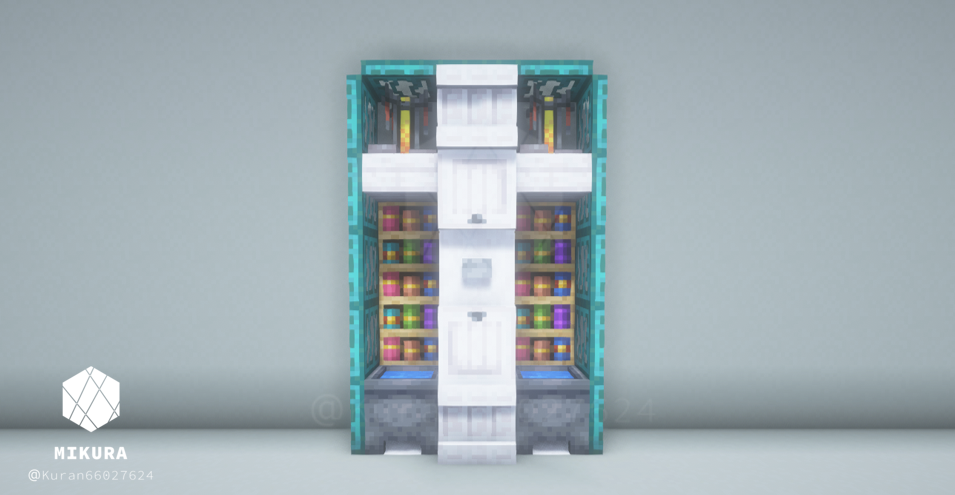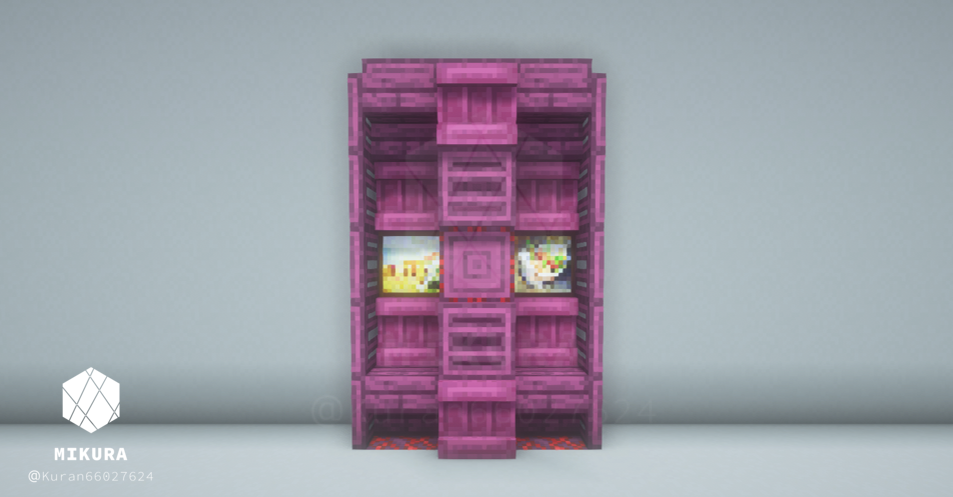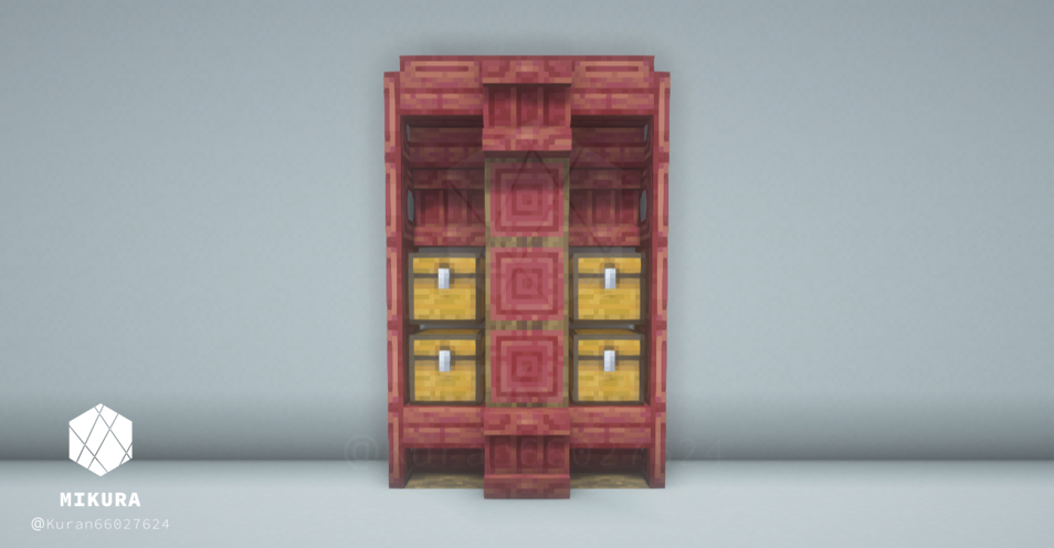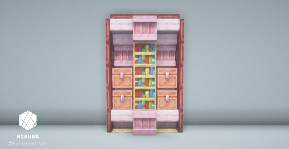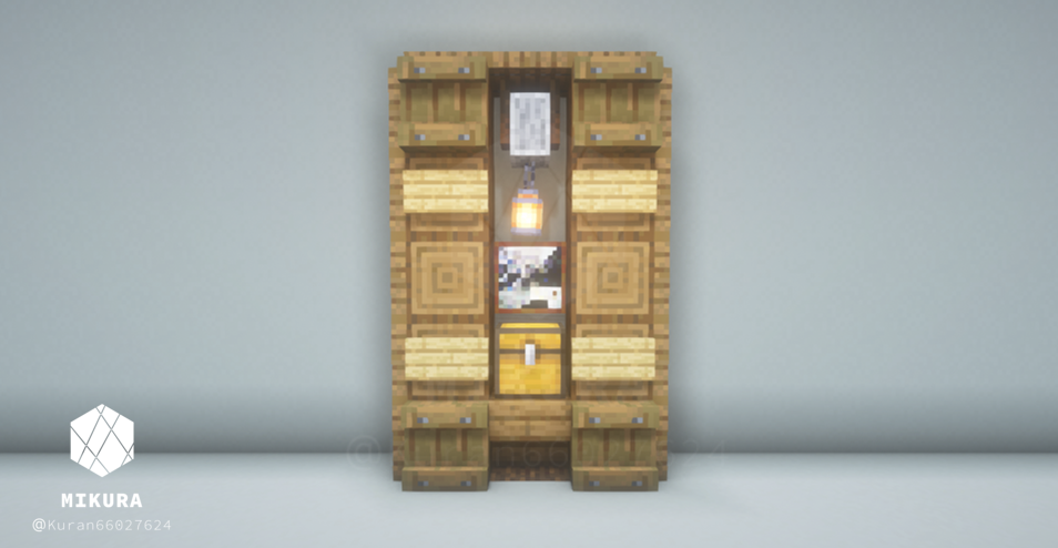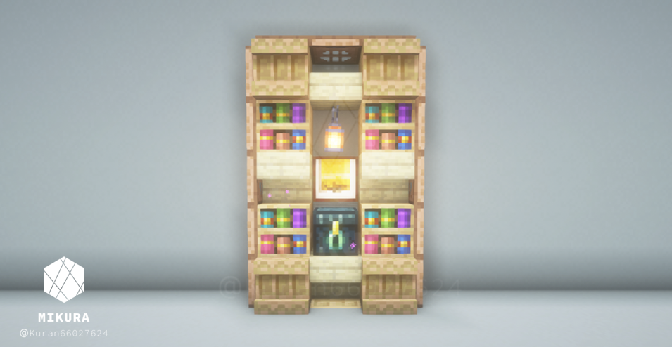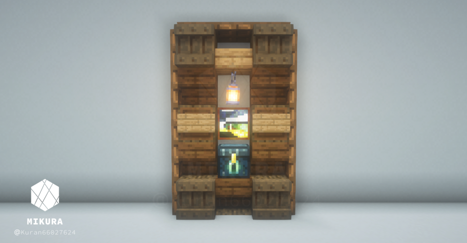3×5ブロック分の大きさの木製棚のアイデアをまとめました。(トラップドア・床を含めると5×7ブロック)少し大き目の棚なので、邸宅の書斎や大学の研究室、オフィスの書庫装飾など、大き目の施設におすすめのアイデアです。内装の色味に合わせておすすめのデザインをお選びください。