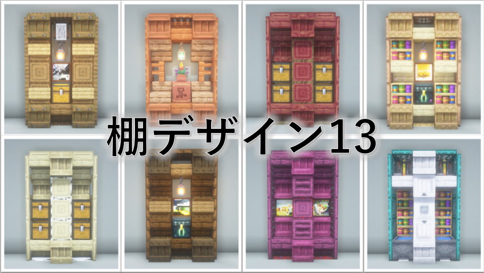 3×5ブロック分の大きさの木製棚のアイデアをまとめました。(トラップドア・床を含めると5×7ブロック)少し大き目の棚なので、邸宅の書斎や大学の研究室、オフィスの書庫装飾など、大き目の施設におすすめのアイデアです。内装の色味に合わせておすすめのデザインをお選びください。