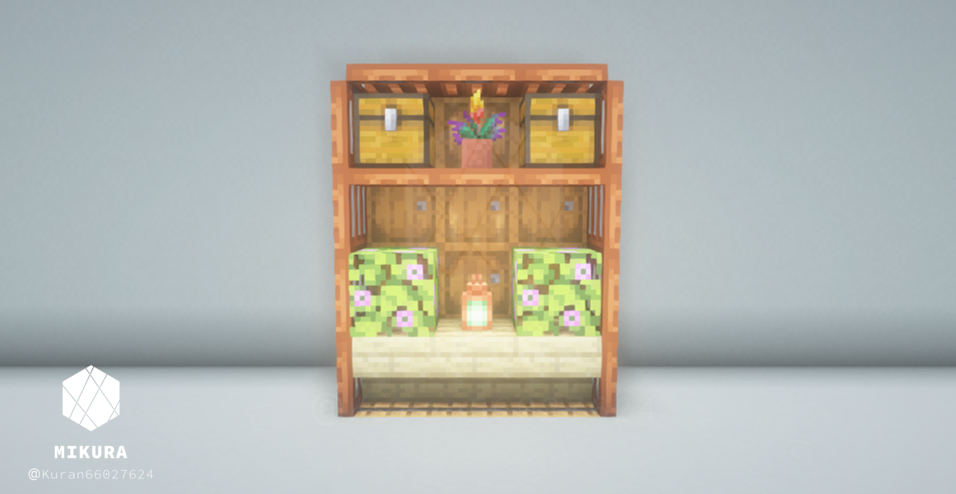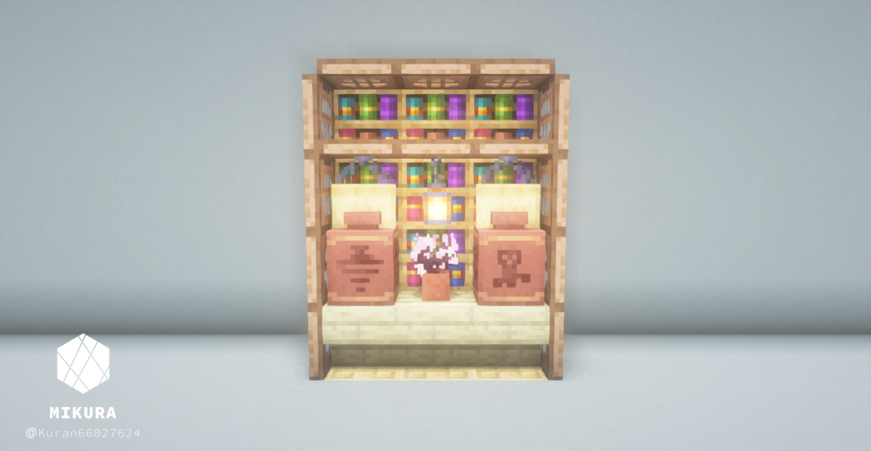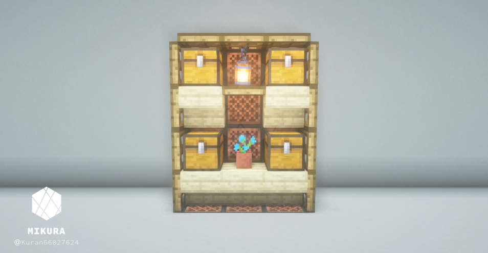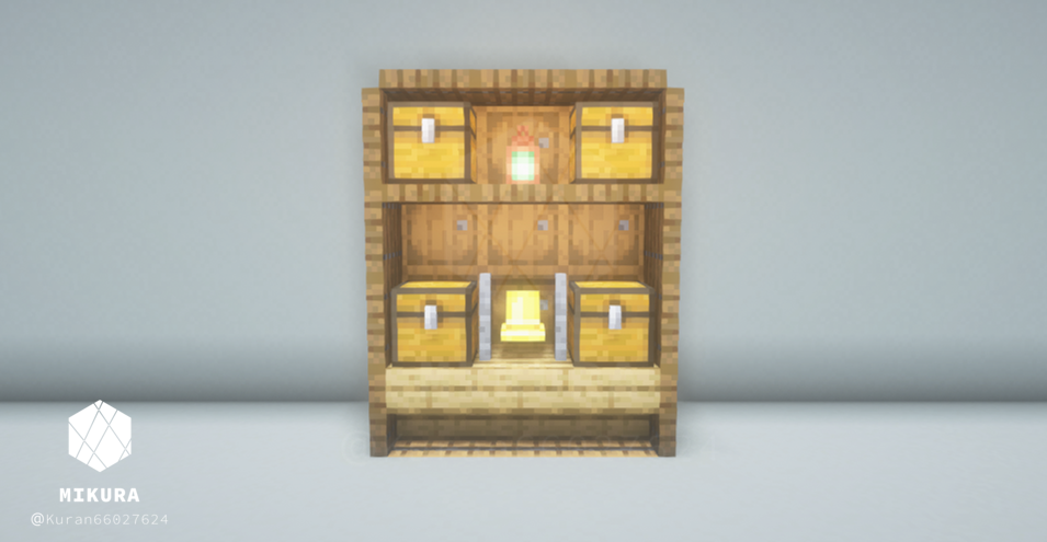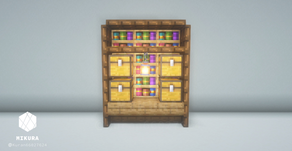 下のアカシアの棚のように、チェストを葉っぱブロックなどの色味が違うものに置き換えることで、鮮やかな見た目の棚にすることができます!