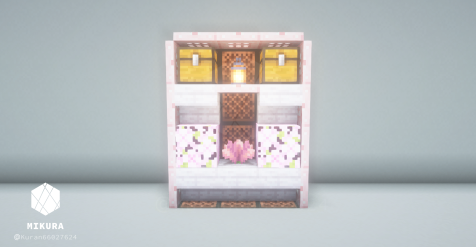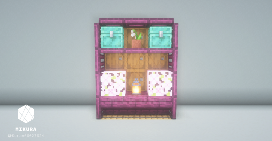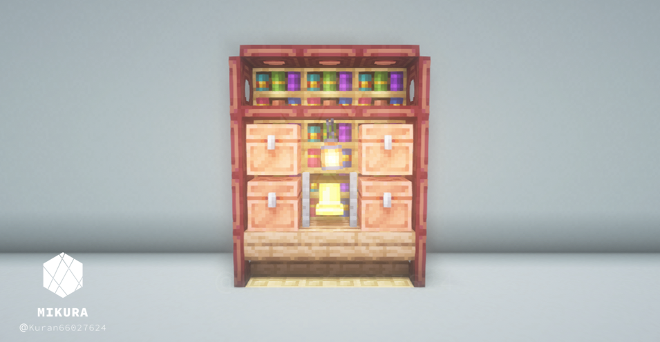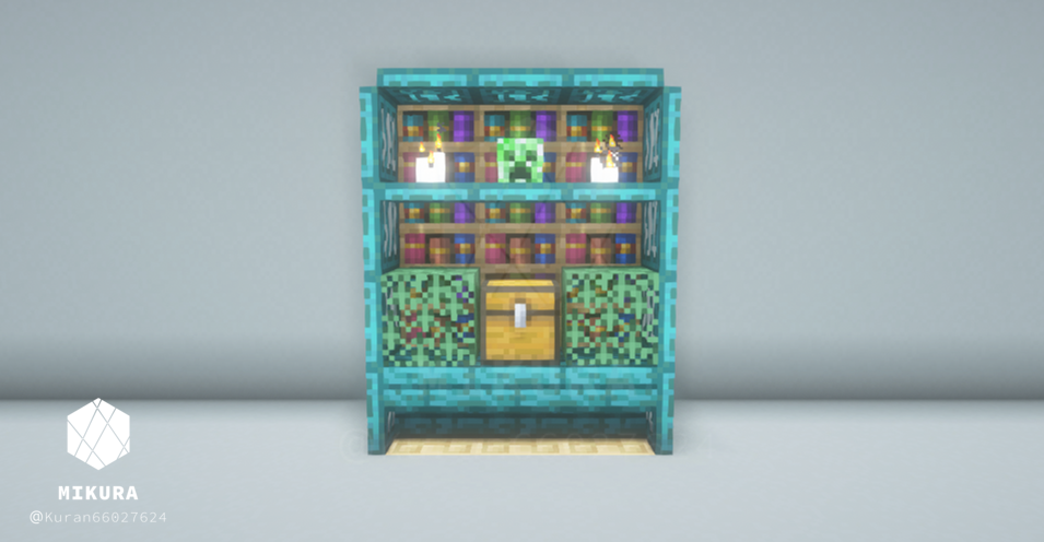 作りは上の樽ブロックを使用した棚とほとんど同じです。模様入りの本棚をメインに使用し、チェストの位置を変更しています。