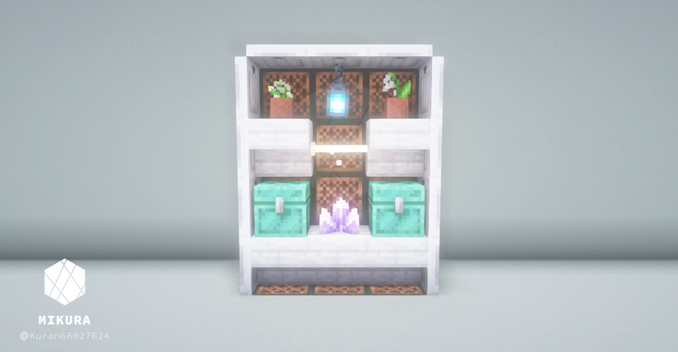 3×4ブロック(トラップドア・床を含めると5×6ブロック)の小さな棚ブロックを作りました。それぞれ、樽ブロックを使用した棚・模様入り本棚のある棚・音符ブロックのある棚です。部屋の雰囲気に合ったデザインのものをお選びください。