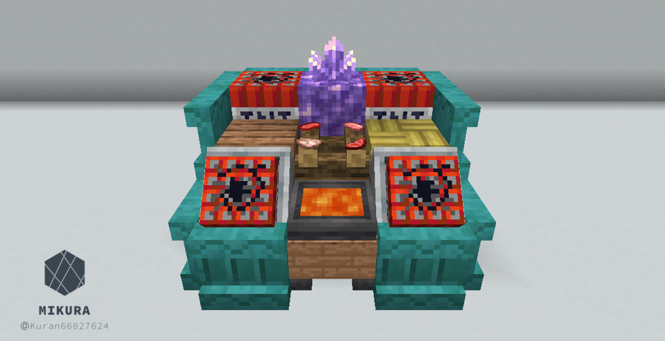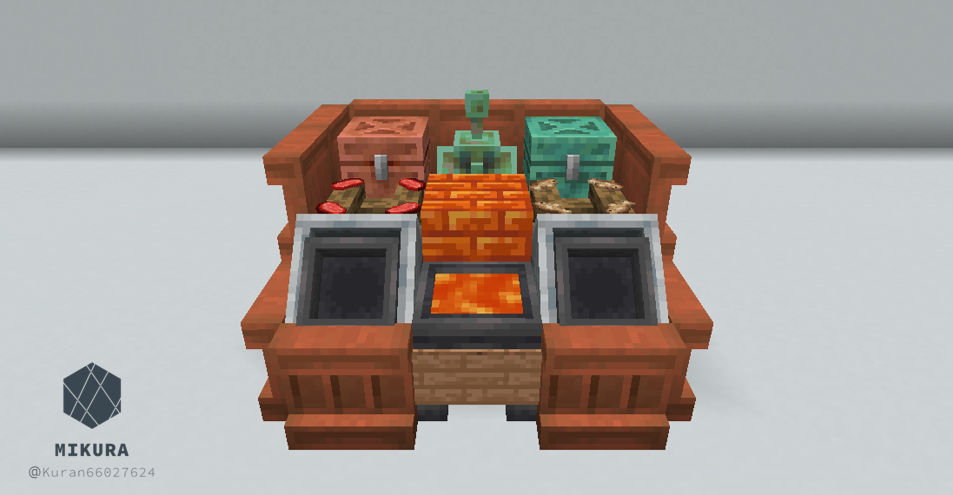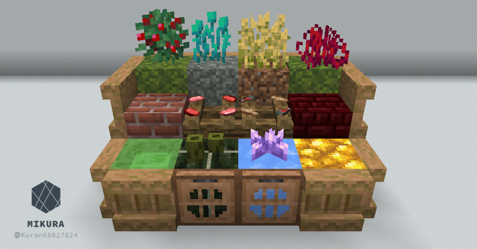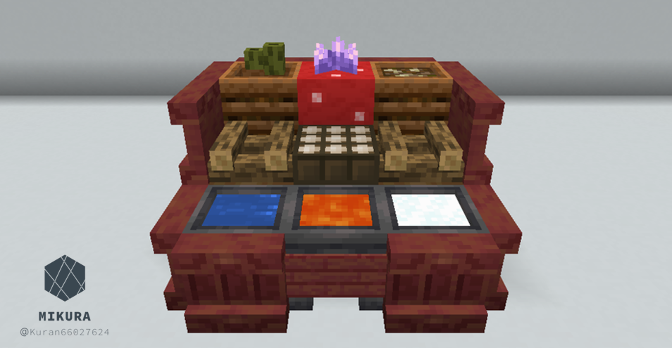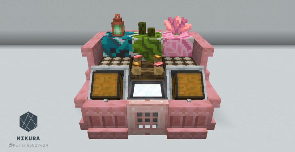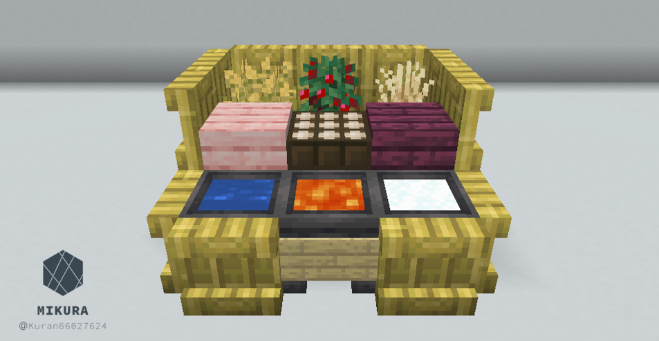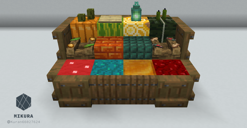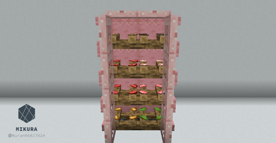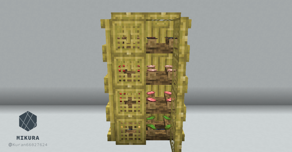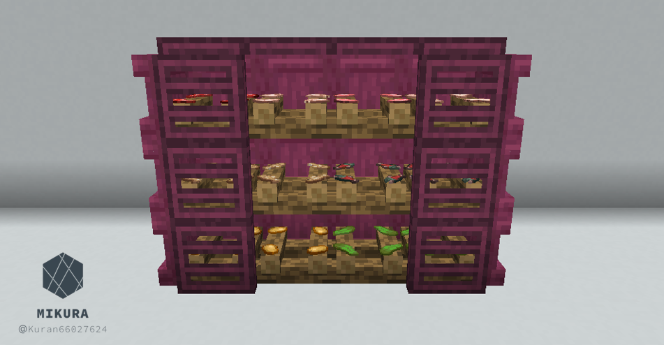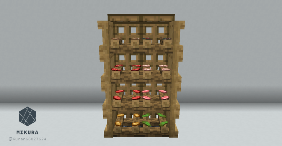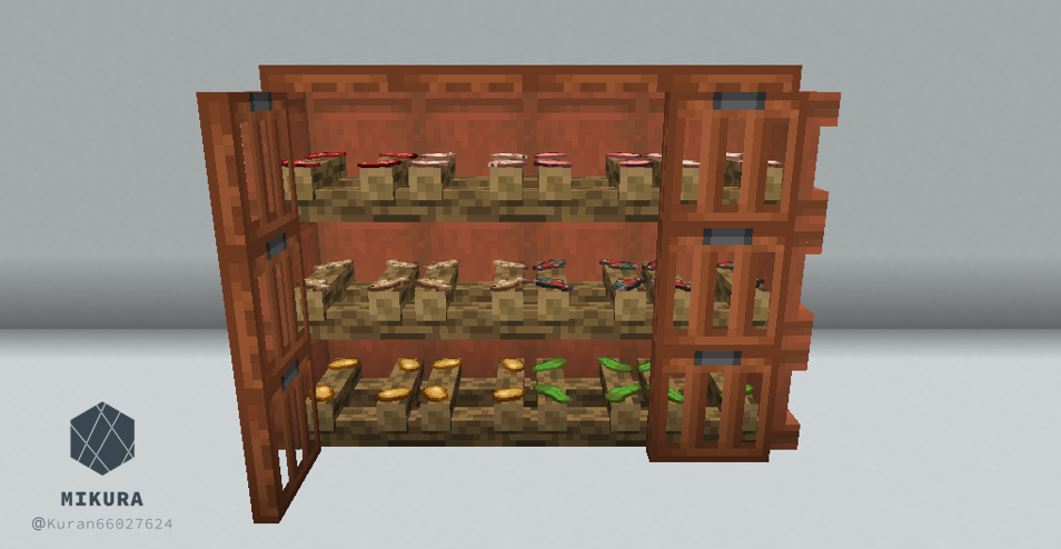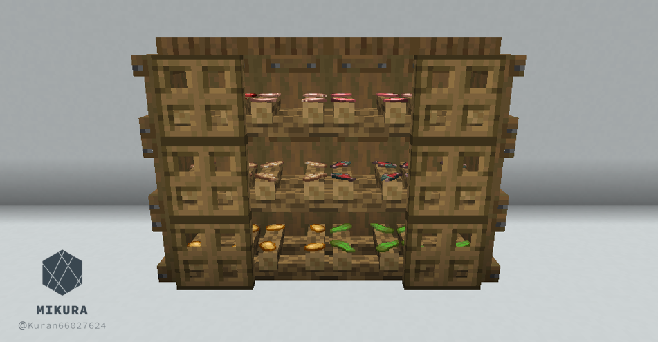 version1.21.10で追加された棚ブロックを全面に使用した、食糧用の棚デザインです。棚ブロックに食糧を保存する見た目ではなく、全体的に食糧棚のように見えるような作りにしてみました。パントリーやお店の食糧庫、展示用の棚としても使いやすいデザインです。