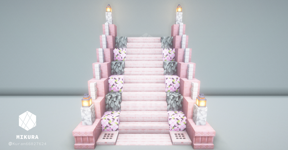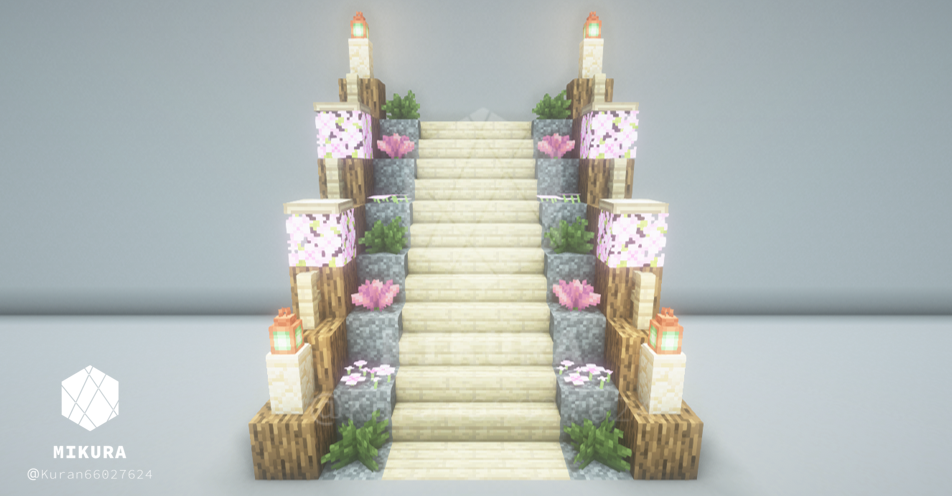 シラカバと色あせた苔ブロックは落ち着いた組み合わせなので、差し色にピンク色を追加しています。桜の葉ブロック・サボテンの花・桜色の花びらを組み合わせました。