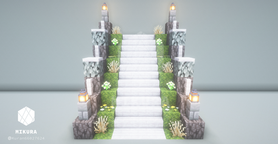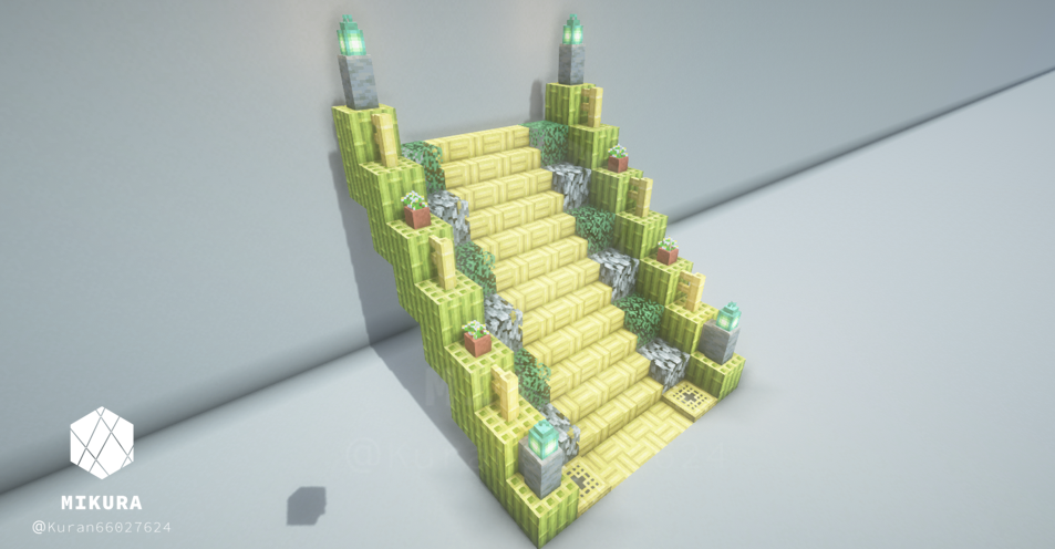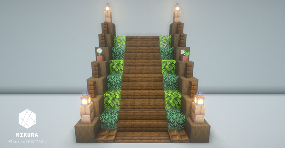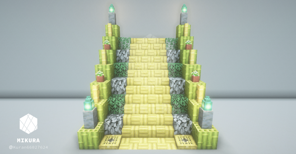 苔ブロックや葉っぱブロックなどの植物系ブロックで装飾した階段のアイデアです。庭園や植物いっぱいの街で使えそうな階段をイメージして作りました。他とは違った雰囲気の階段を作りたいときにおすすめのデザインです。