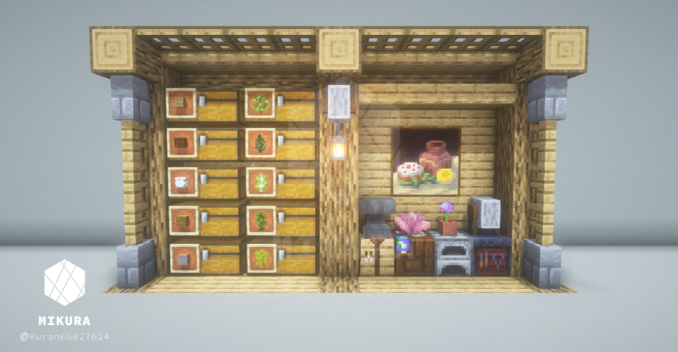 サバンナバイオームにスポーンした時を想定して作ったアカシアの収納アイデアです。右のエリアを葉っぱで装飾しています。背面にはジャングルの板材を組み合わせて使用しています。