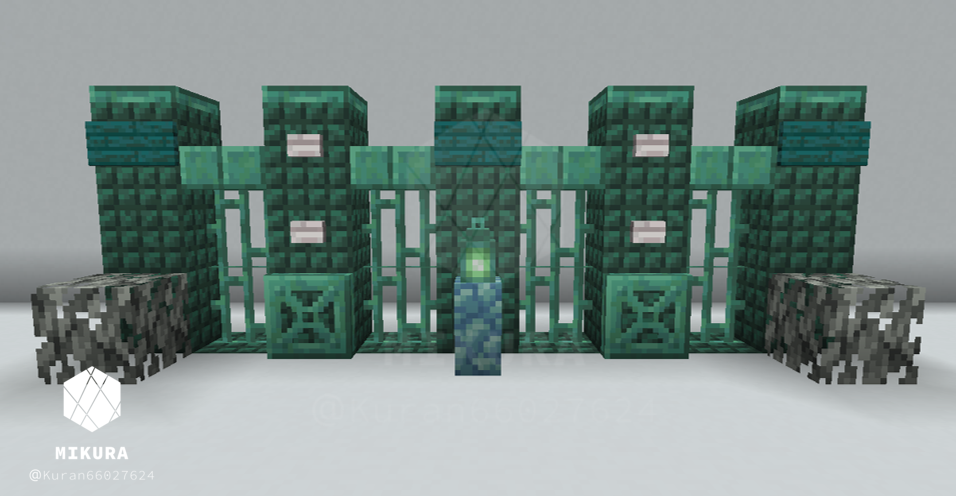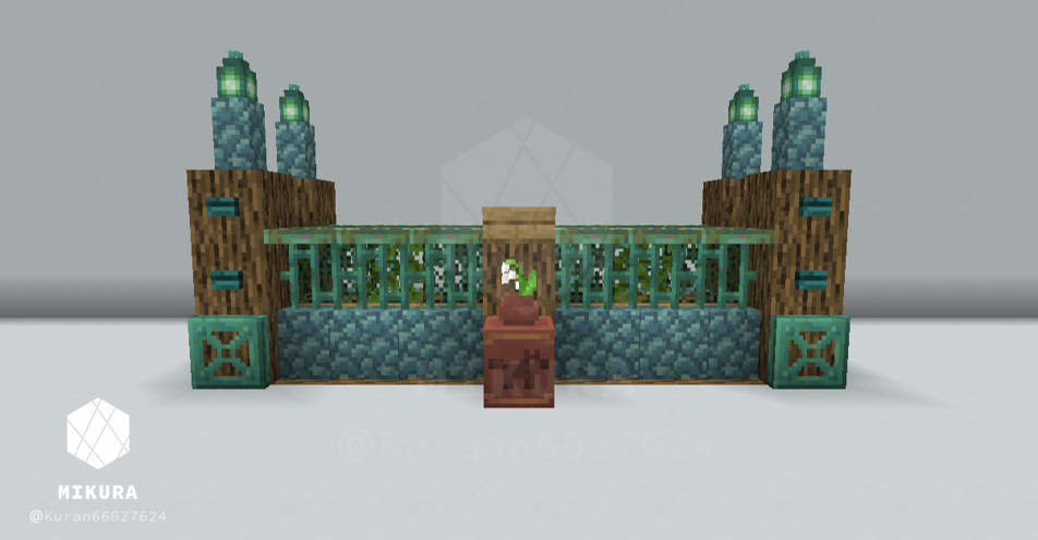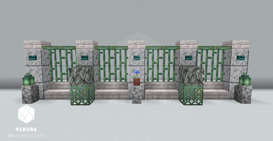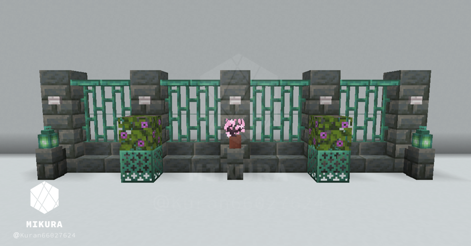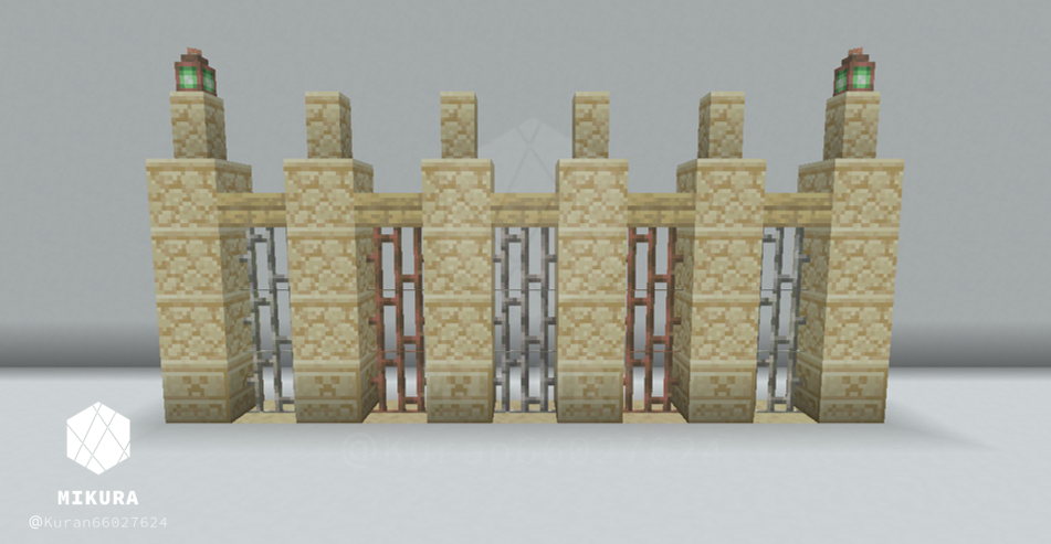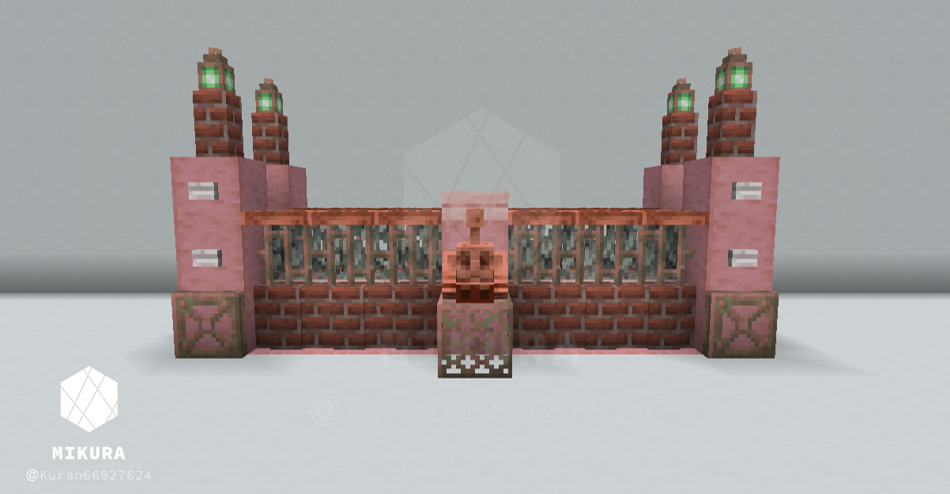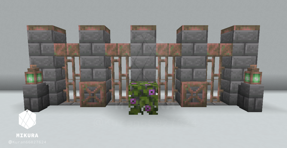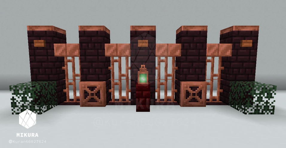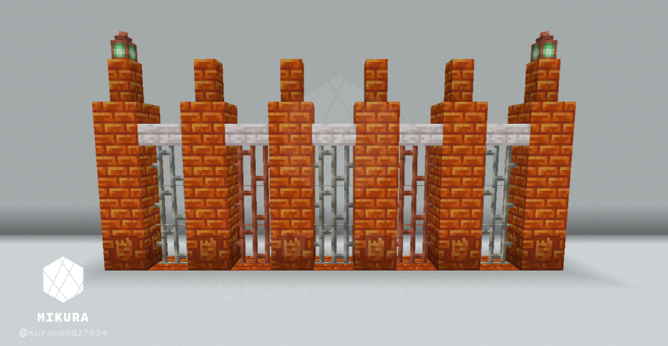 2ブロックおきに塀の柱を設置し、銅格子で装飾した塀のアイデアです。高さ3.5ブロックで、公園や家の塀として使いやすい見た目にしてみました。