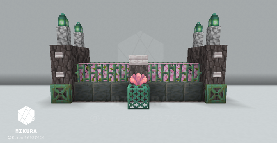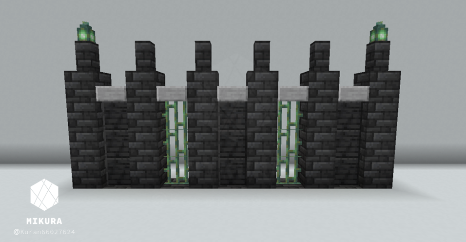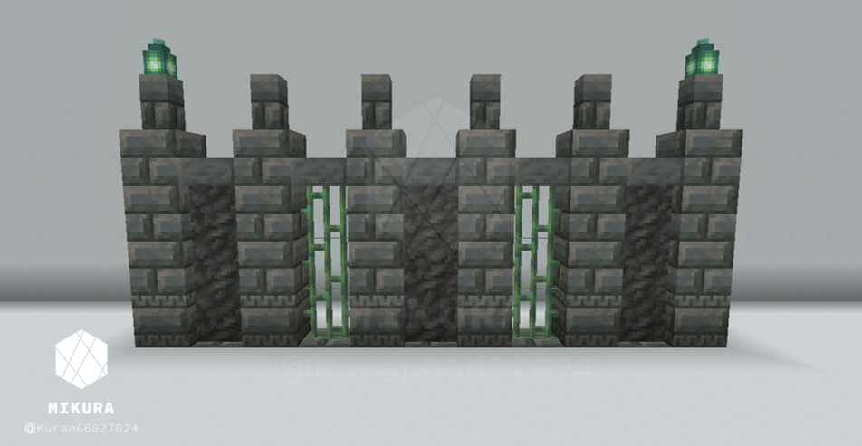 厚みが3ブロック分(トラップドアを含めると5ブロック分)ある塀のアイデアです。塀の間に葉っぱブロックを設置して色味を足しています。