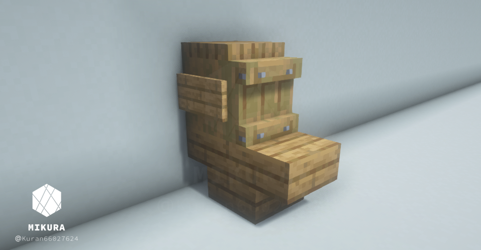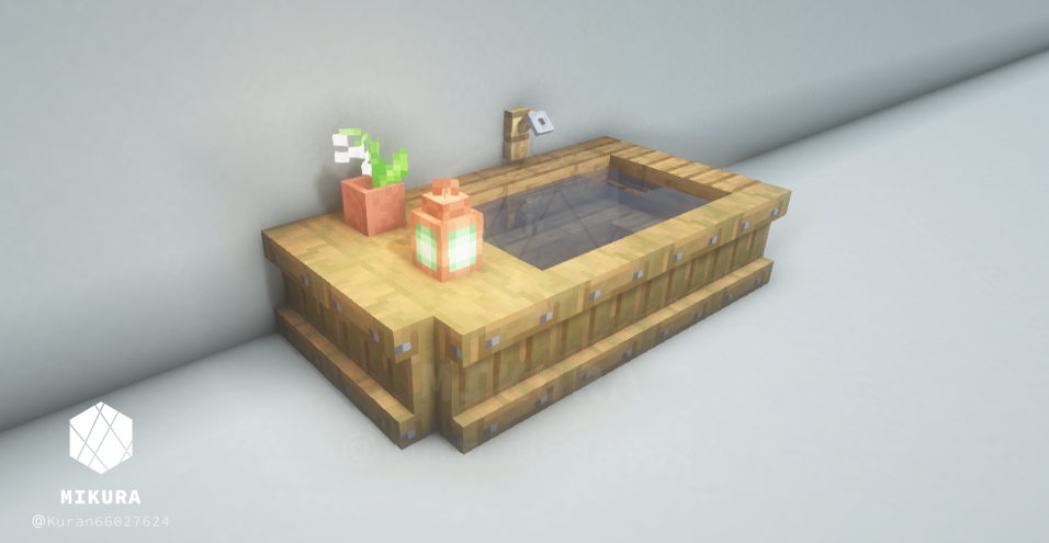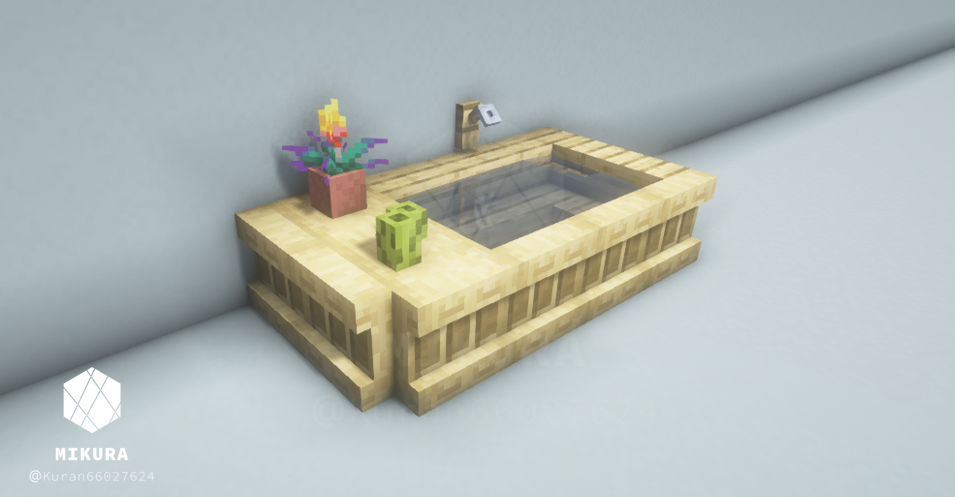 棚ブロックを使用した水回り(お風呂・トイレ)のアイデアをまとめました。縦ハーフブロックのような使い方ができる棚ブロックで木材別にシンプルに作っています。特に和風建築と相性のいいデザインなので、ヒノキ風呂のような見た目のお風呂を作りたいときにおすすめのデザインです。
