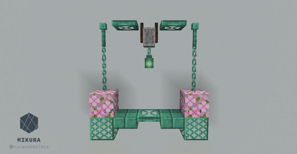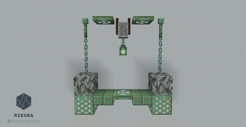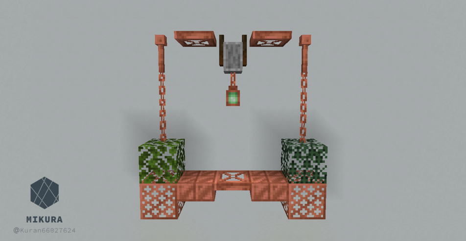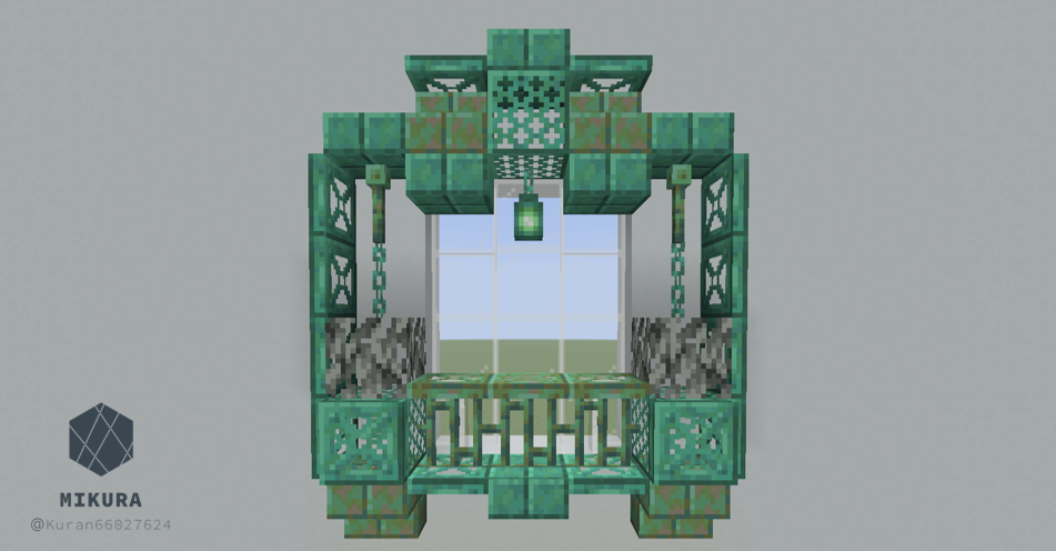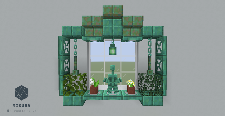 窓枠だけでなく、壁際の吊り植物として単独で使用することも可能なパーツのアイデアです。銅系ブロック4種をそれぞれ使用しています。